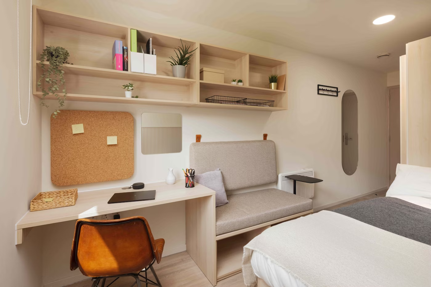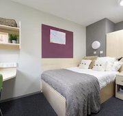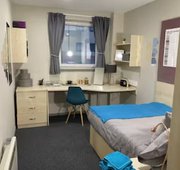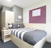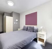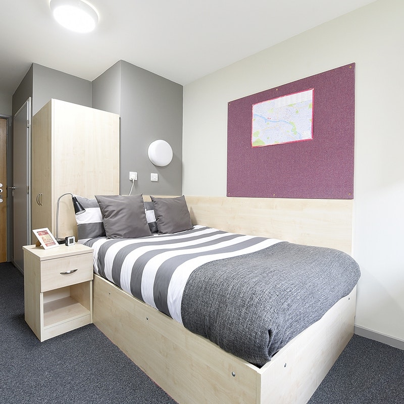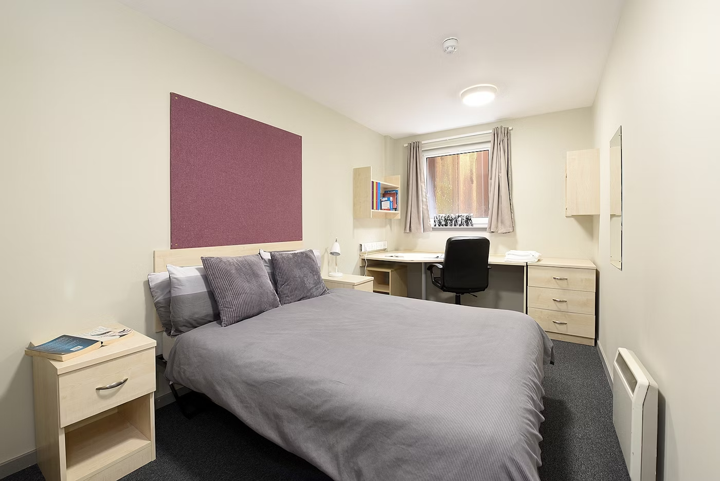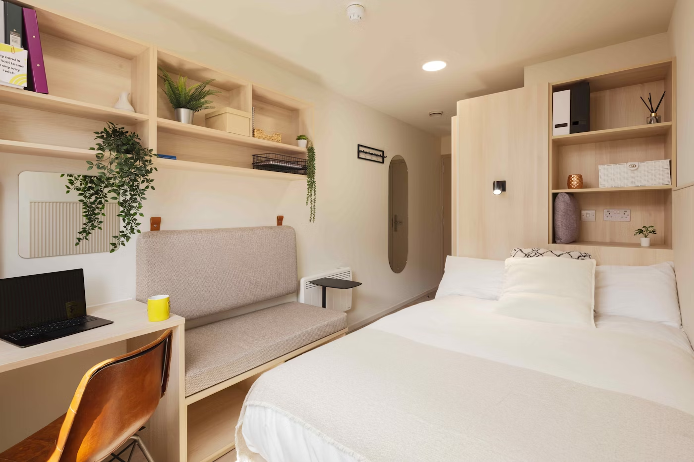 Approximately 13.2m², Communal kitchen and living space with up to 5 en-suite rooms per flat. Situated on the 6th and 8th floor. Small double bed, Underbed storage, wardrobe, personal study space with desk and chair included in the room