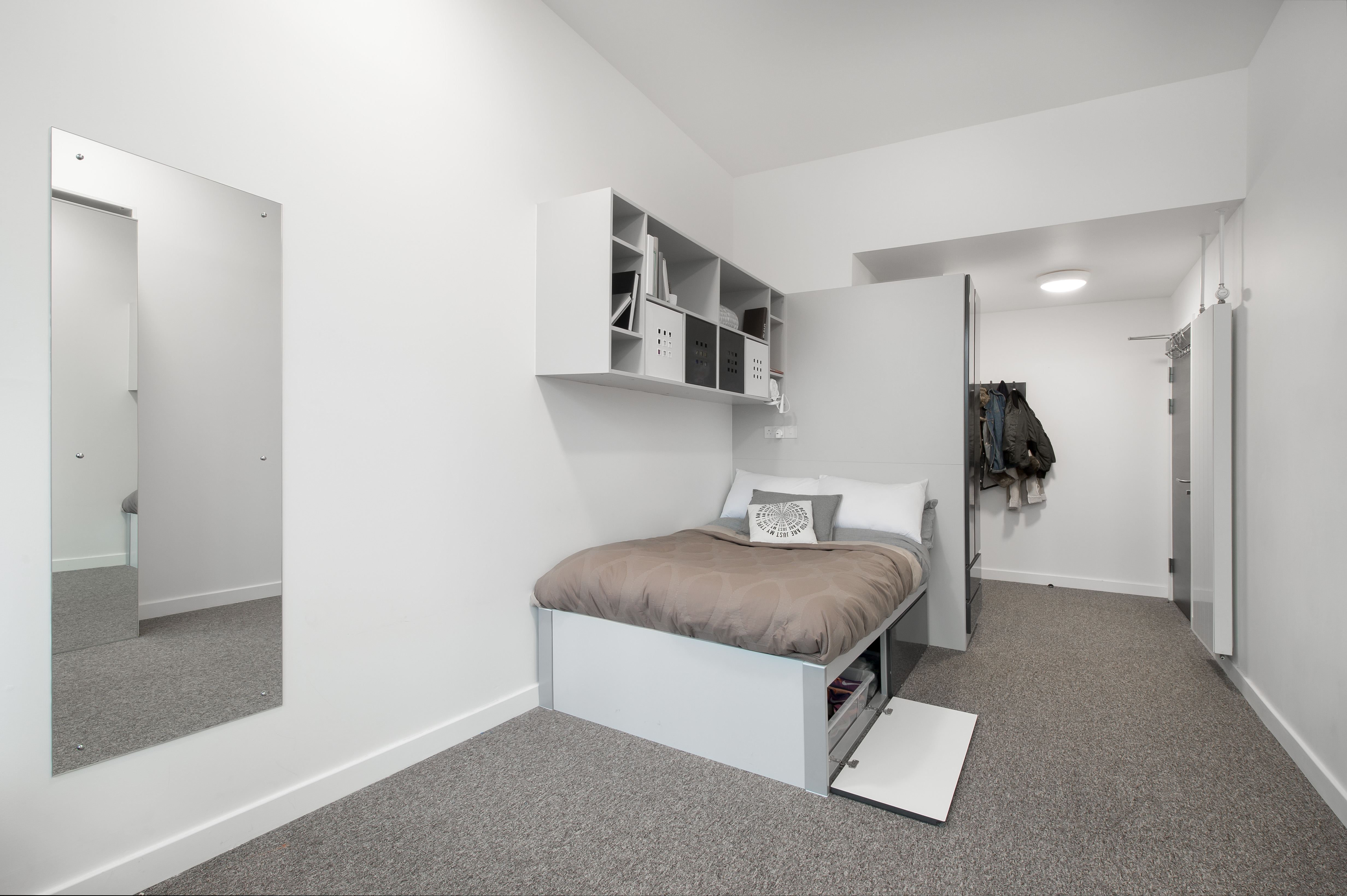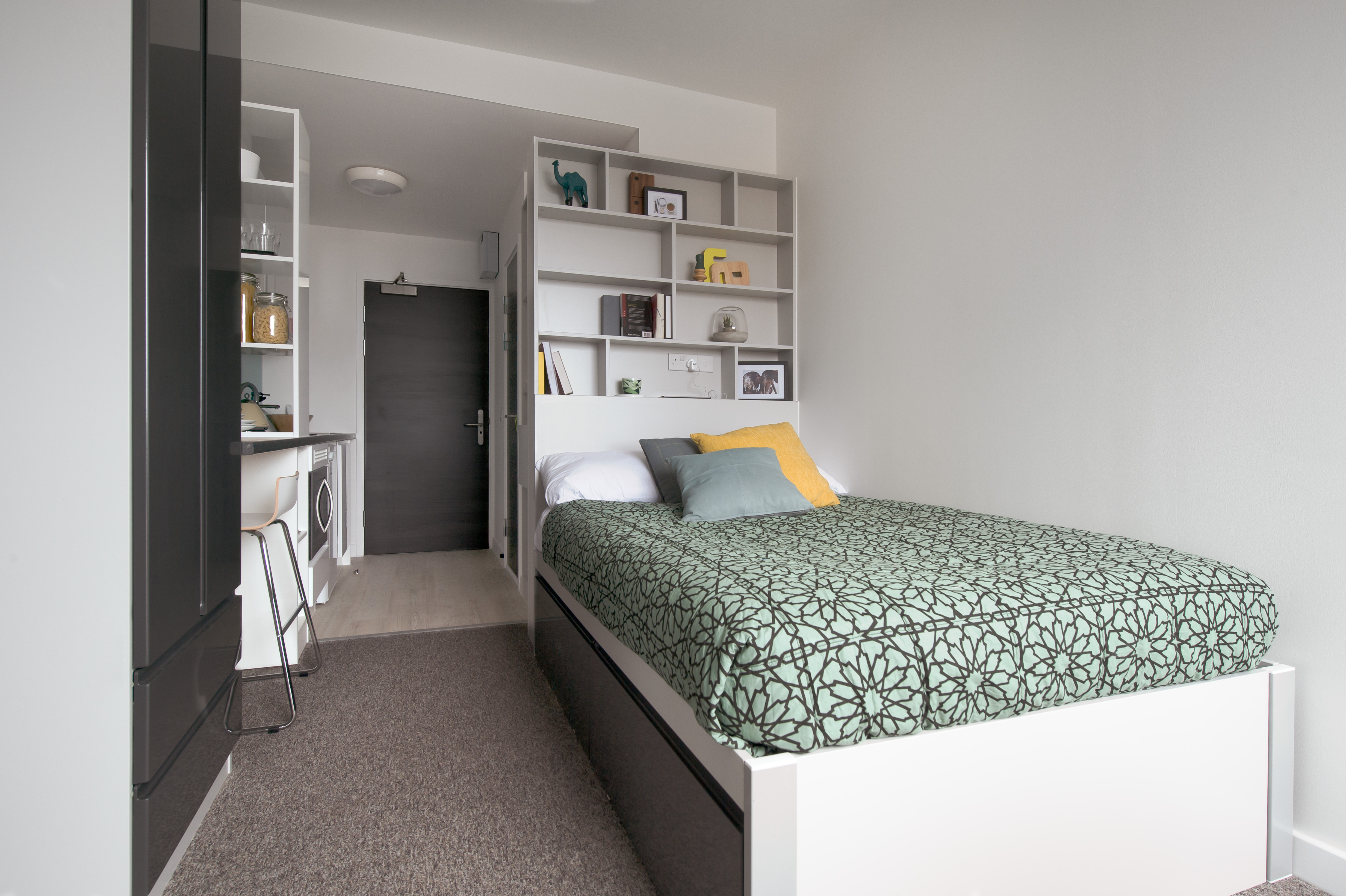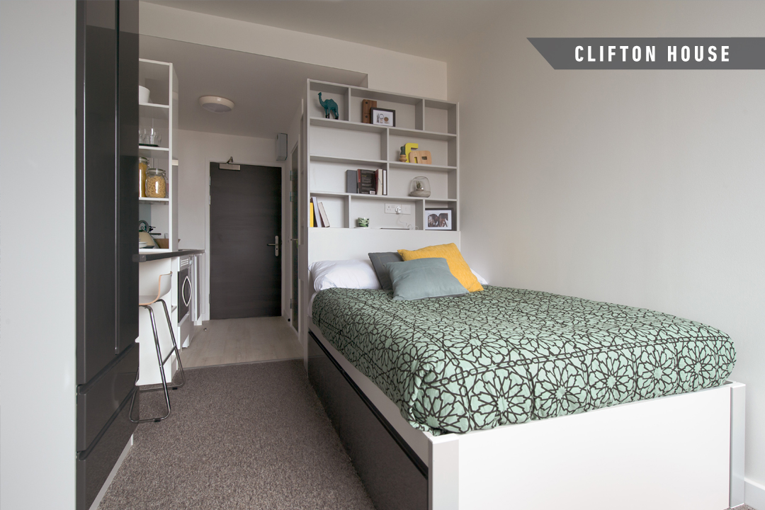 Size: 18m2 3/4 bed with storage Self-contained and private En-suite Fully fitted contemporary kitchen Breakfast bar Large desk and chair Wardrobe