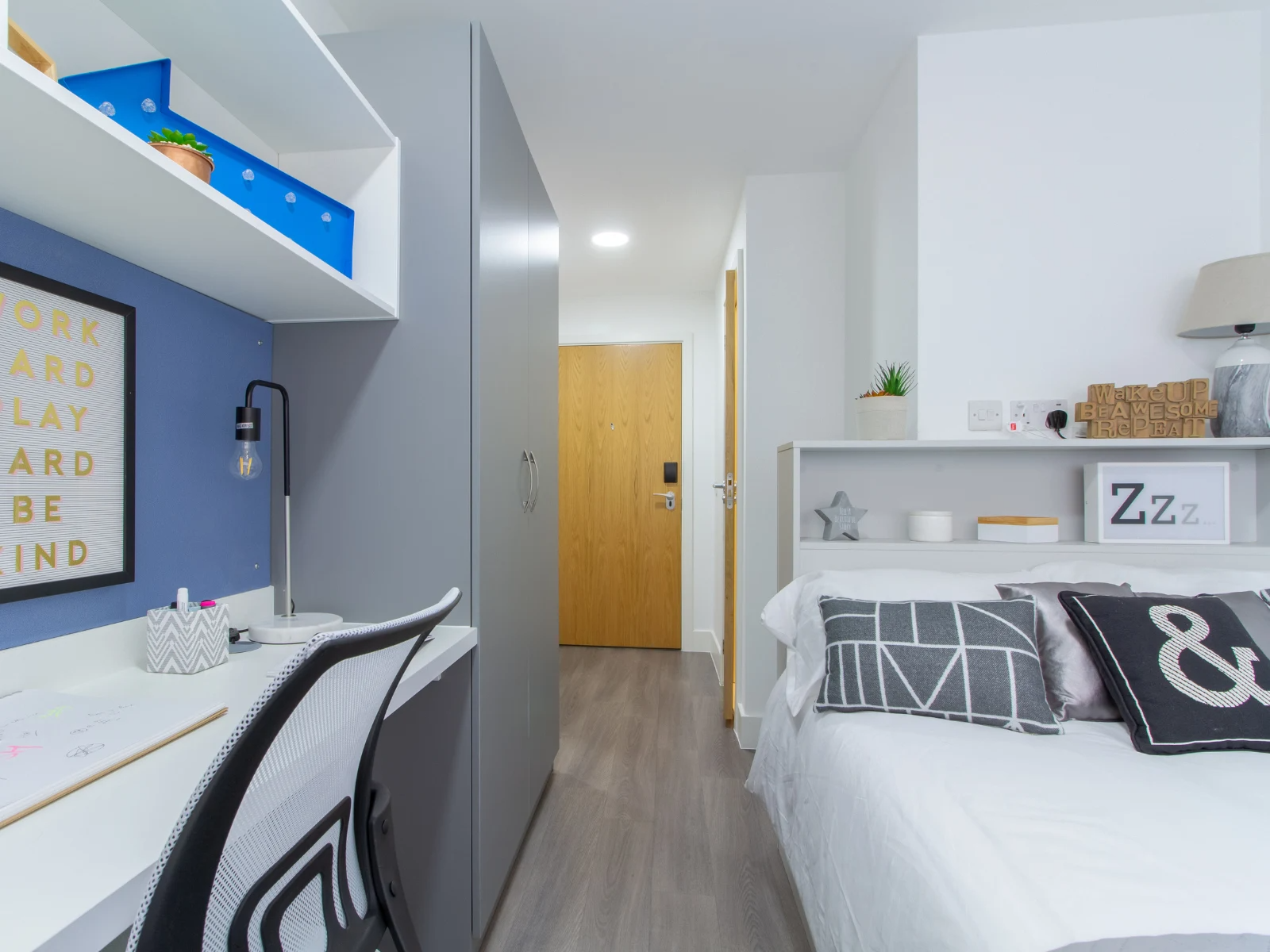 These ground floor en suites provide you with a small double bed alongside your own en suite shower room. There’s ample storage, a study space, and access to the apartment’s shared kitchen/living room.