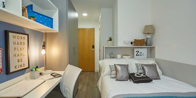 Self-contained studio living starts here for you and perhaps your plus one (pay no more for their stay). Your new home will come with an en suite shower room, double bed, storage, fitted kitchen and space to study.