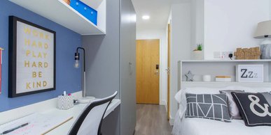 Located on floors 3-6, these en suite rooms have a small double bed along with your own en suite shower room, storage and space to study, and access to a shared kitchen/living roo