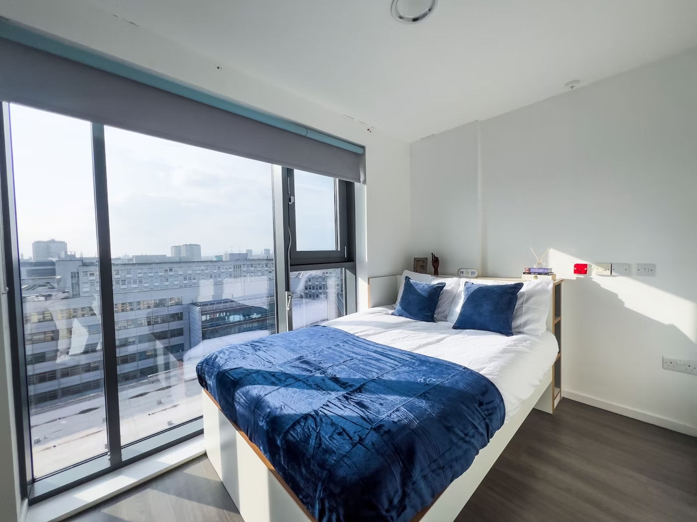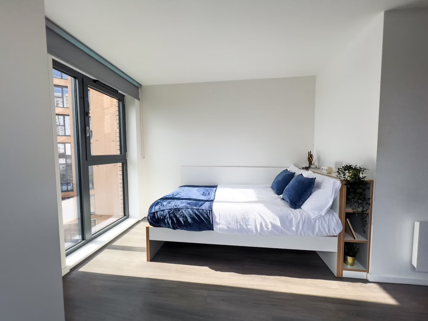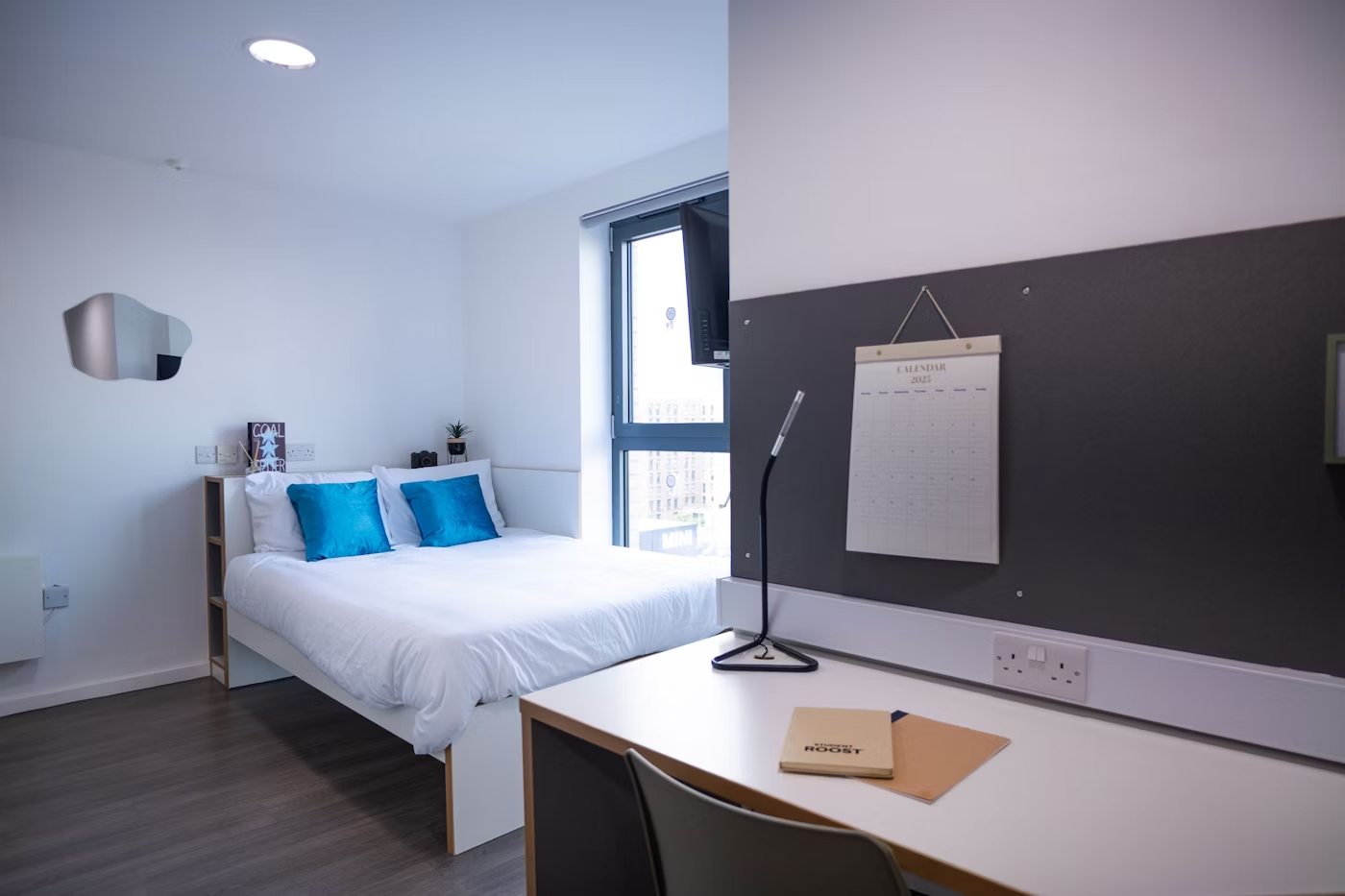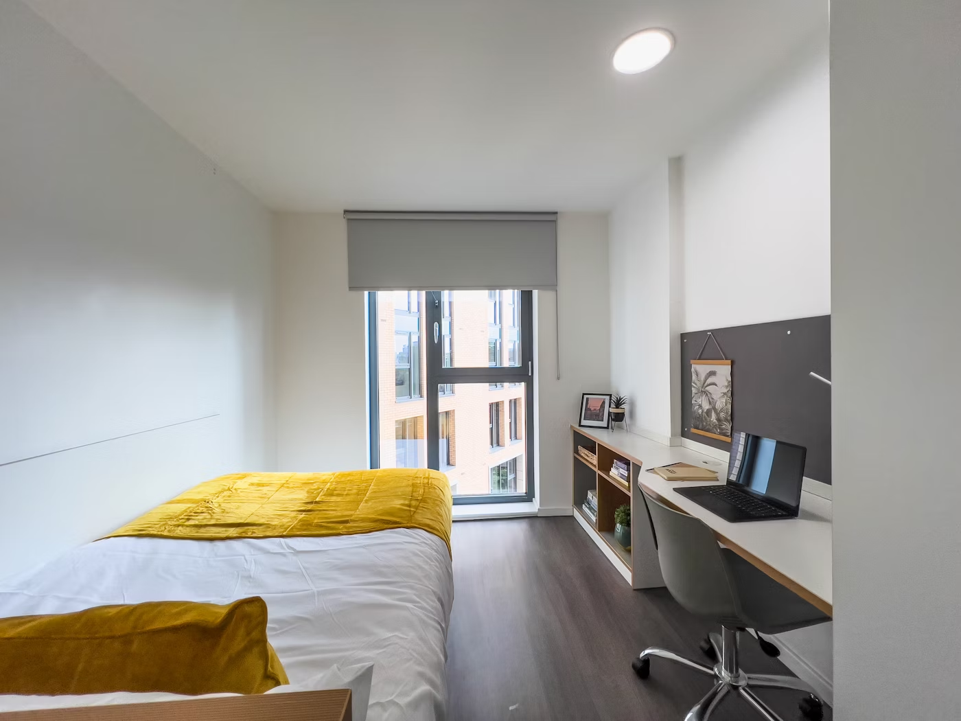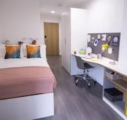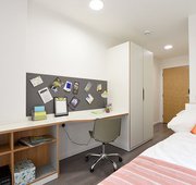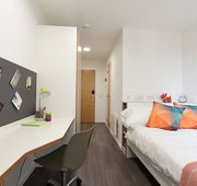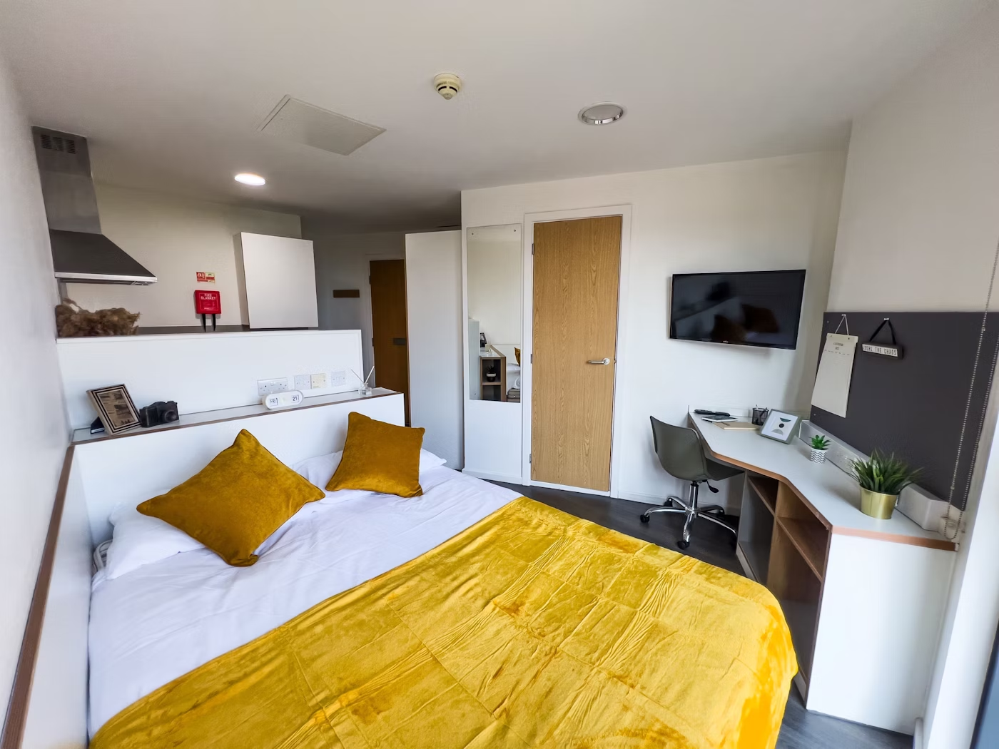 Communal kitchen and living space with a TV. Up to 6 en-suite rooms per flat. Approximately 14m² Small double bed Underbed storage, wardrobe, personal study space with desk and chair included in the room