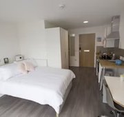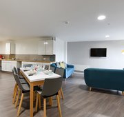 Communal kitchen and living space with a TV. 7 or 8 ensuite rooms per flat Situated on lower and ground floors Approximately 14m² Small double bed Underbed storage, wardrobe, personal study space with desk and chair