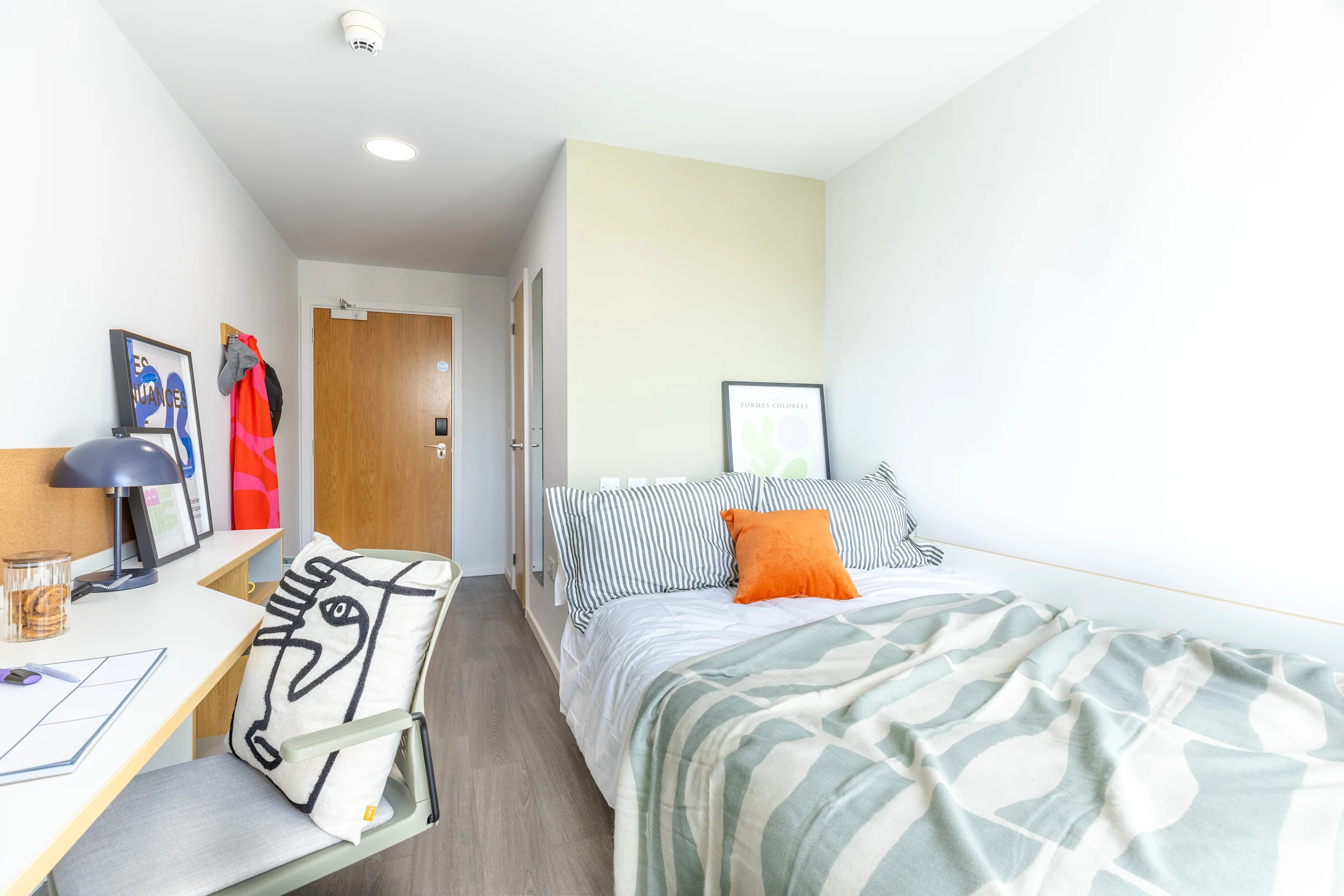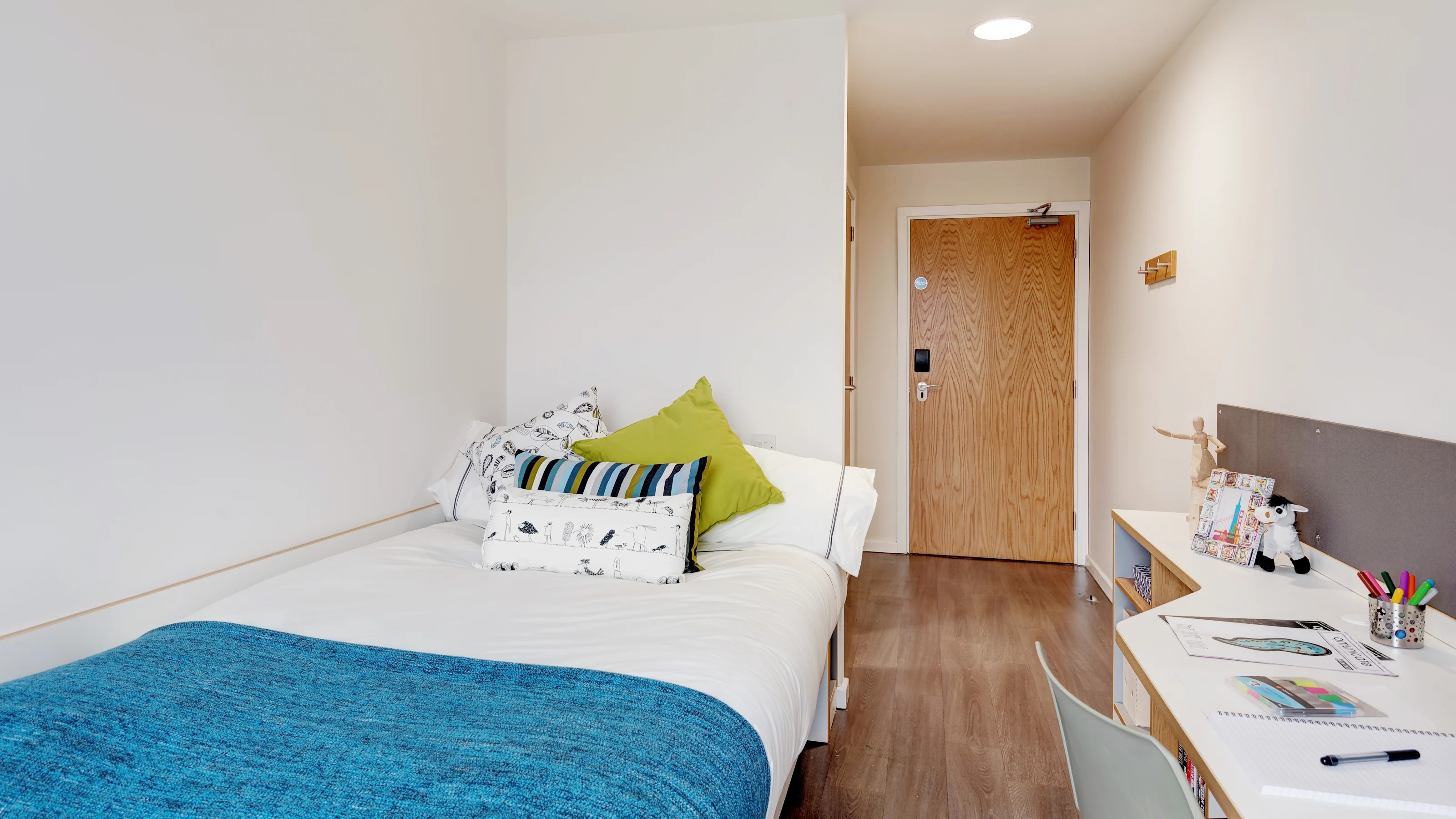 All our usual fab features with a small double bed alongside the en-suite shower room, ample storage and shared kitchen/living room. Rooms are approximately 14m2 and located on floors 1-6.
