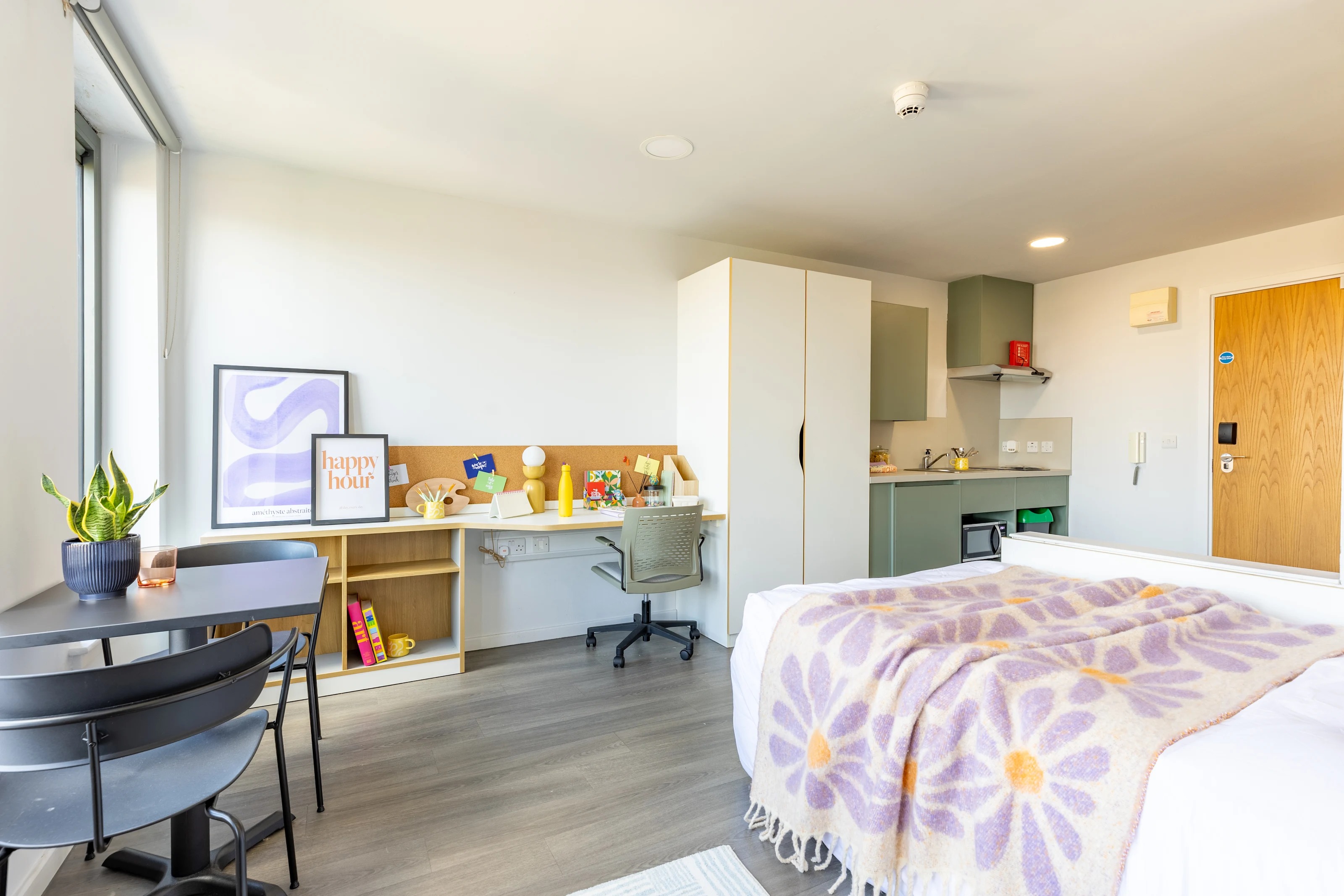Self-contained studio living starts here for you and perhaps your plus one. If you choose to share the en-suite shower room, double bed, bags of storage, fitted kitchen and study area, theres no more to pay for couples.