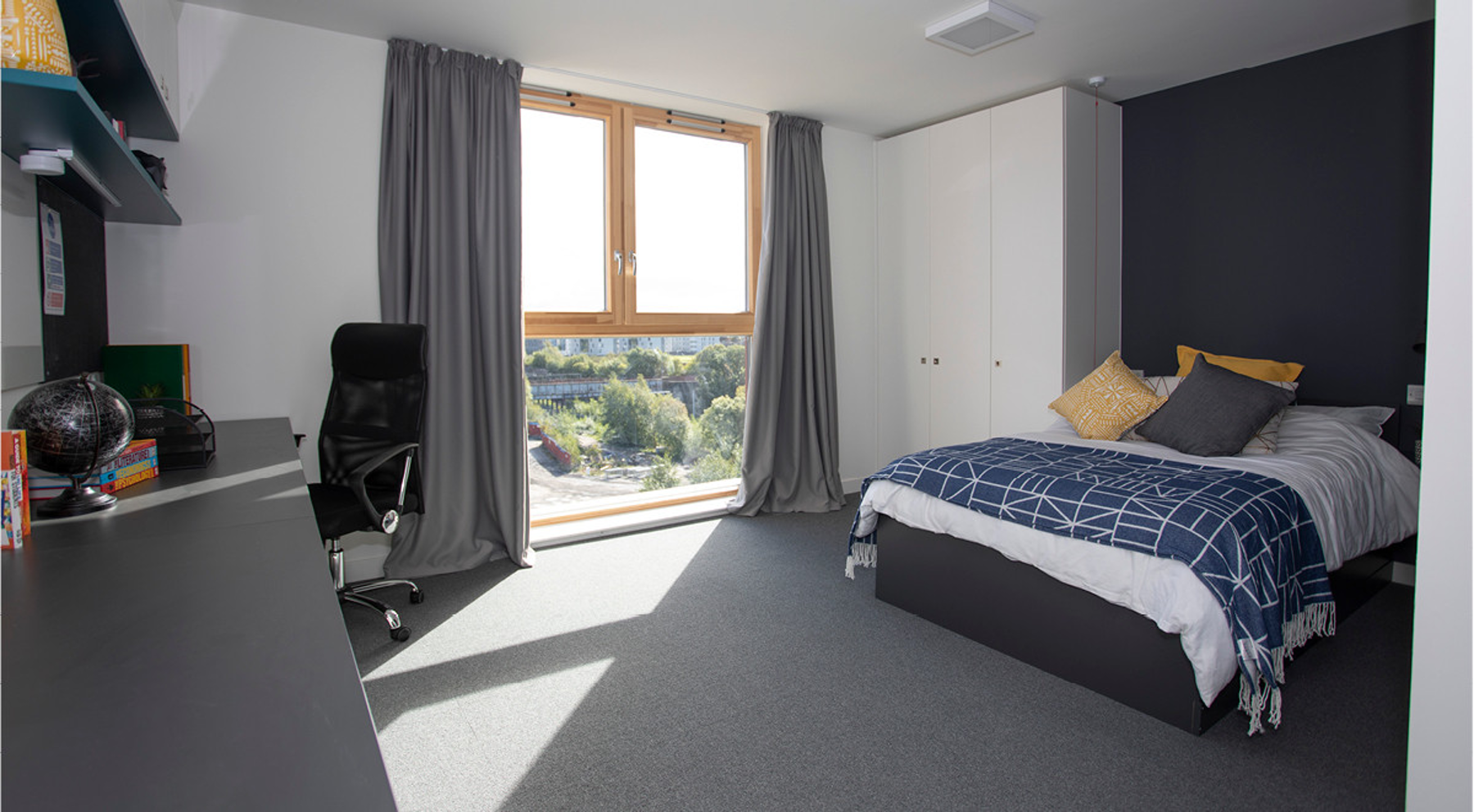 A larger self-contained studio with a fully fitted kitchenette, stylish en-suite bathroom and ample storage. These rooms also have a three quarter sized bed, and a large study desk and chair. You will also have access to the beautiful landscaped gardens, cinema room and on-site gym!