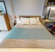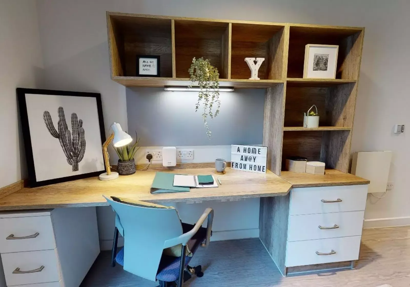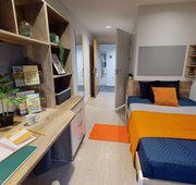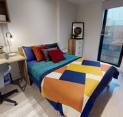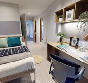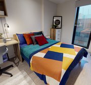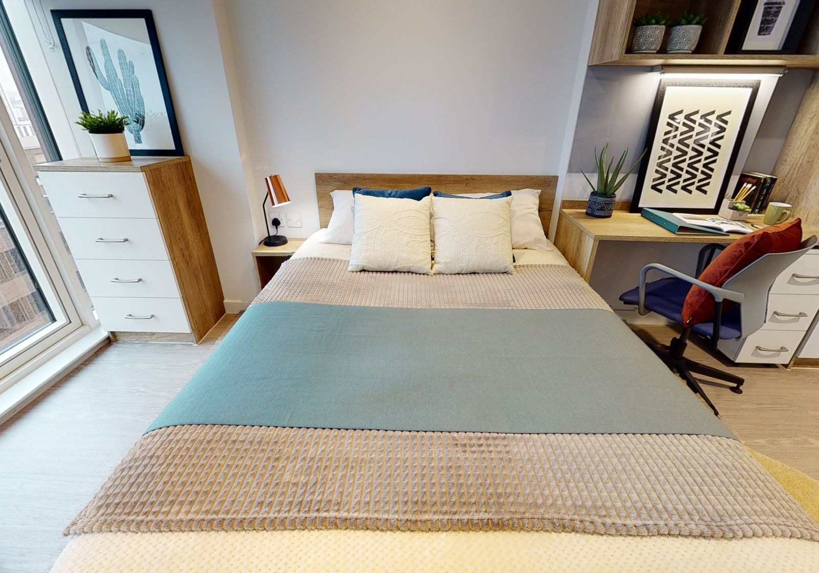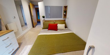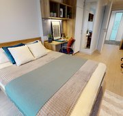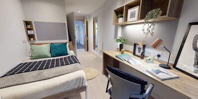 ELGI250-031125Our entry-level rooms are carefully designed to get the most out your space, with around 14 sq m of space containing a small double bed, modern furniture, private bathroom and large recessed window. These great value rooms mean you don’t need to compromise on privacy and comfort. With plenty of storage space and a study desk and chair, you’ll have everything you need. A big shared kitchen and living space means you get the best of the student experience, and with a creative studio, 7th floor terrace, a gym, private dining room and a pool table in this newly designed building, you’ll have everything you need for a great life at uni.