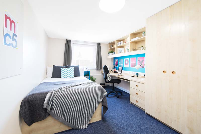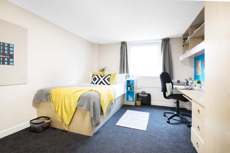 Merchant City House is a Glasgow student accommodation offering accommodation to students attending nearby universities and institutions. Merchant City House has a range of studios and en-suite rooms for you to choose from, with accessible rooms and studios being available as well. All units are mainly fitted with a bed with under-bed storage and a bedside table, a wardrobe, a chest of drawers, curtains, a full-length mirror, a workspace with a desk and a chair, a coffee table, chairs, and an en-suite bathroom with a toilet, a shower, a washbasin, a mirror, and a mirrored cabinet. Kitchens are generally equipped with a combination oven, a microwave, cooking hobs, a fridge/freezer, a ventilation system, and a breakfast bar with stools. Other available room contents at Merchant City House may include a vacuum cleaner, an iron with an ironing board, a notice board, a mop and bucket, a dustpan and brush, a dining table, and a sofa.