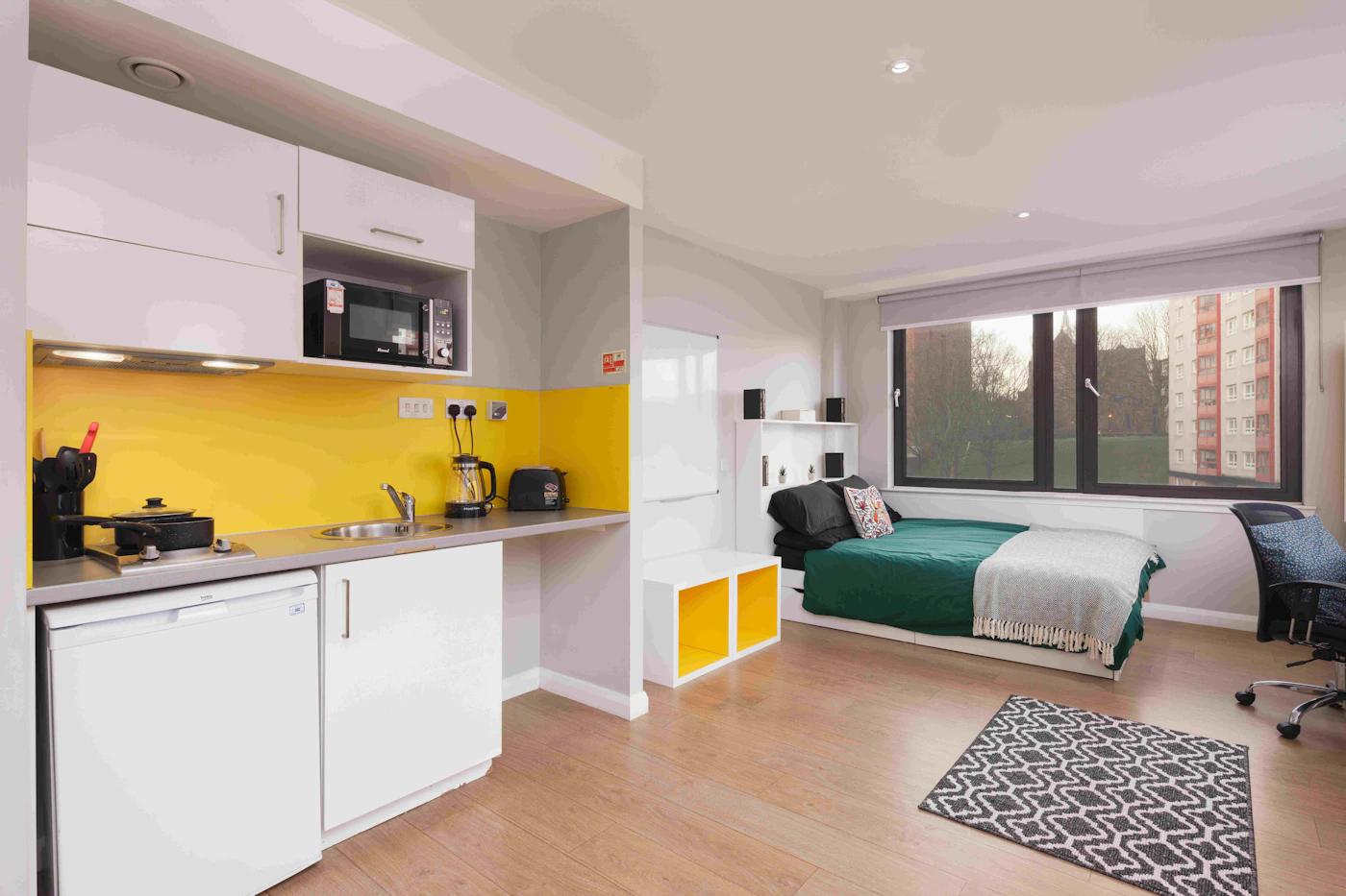 Located on the ground floor Approximately 21.3m Self-contained studio with bedroom kitchen and bathroom Double bed, under-bed storage, wardrobe, personal study space with desk and chair Dual occupancy options