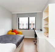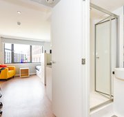 The en-suite rooms at Merchant Studios Glasgow include a cosy double bed, lots of storage, a private bathroom with an en-suite shower, and a desk and chair for a comfortable study session. For unwinding and cooking with your roommates, take advantage of the integrated living room and kitchen at Merchant Studios student accommodation.
