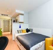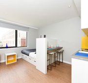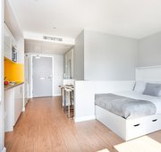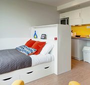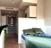 Self-contained studio with bedroom kitchen and bathroom. Dual-occupancy available. 18.9-19.5m², Double bed, Underbed storage, wardrobe, personal study space with desk and chair. Self-contained kitchen and bathroom.