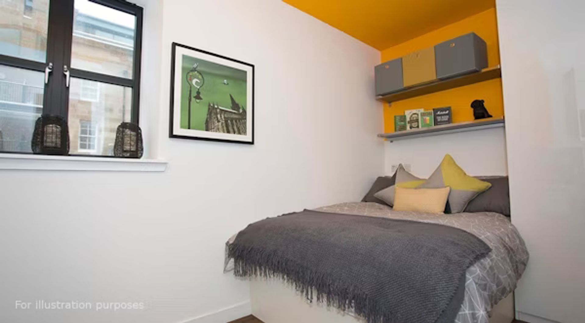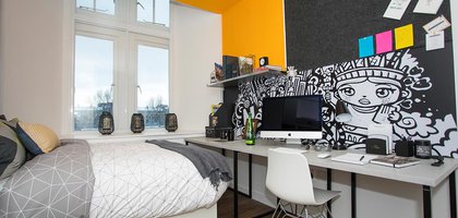 This studio has a New York meets Glasgow loft-style and comes complete a double bed, fitted wardrobe, stylish marble bathroom with full width mirror, study , study area and a modern kitchenette with hob, fridge-freezer and microwave oven. Situated on the top floor, you will have fantastic views across the city. You will also have access to games room, TV area private study areas, café, and private dining room.