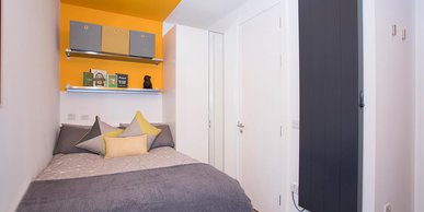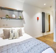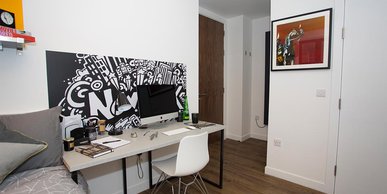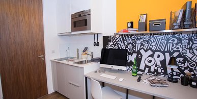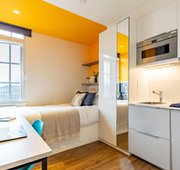 A modern private loft style studio with a double sized bed, stylish marble bathroom with full width mirror, study area and a modern kitchenette with hob, fridge-freezer and microwave oven. You will also have access to games room, TV area, private study areas, café, and private dining room.