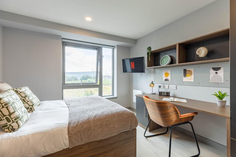 Elevate your living experience with our Penthouse Studios, with the comforts of a private en-suite bathroom, a plush bed, and dedicated study area. Cook up a storm in your fitted kitchen and unwind with entertainment on your personal TV, all while enjoying seamless connectivity with our super-fast Wi-Fi.