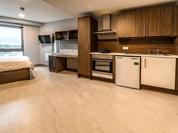 Elevate your living experience with our Deluxe Studios, spanning from 22.5 to 23.4sqm. Enjoy the comforts of a private en-suite bathroom, plush double bed, and dedicated study area. Cook up a storm in your fitted kitchen and unwind with entertainment on your personal TV, all while enjoying seamless connectivity with our super-fast Wi-Fi.