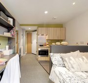 Deluxe Studios come fully-furnished and include a compact double bed with under-bed storage, closet, desk & chair, ensuite bathroom with shower, sink and toilet plus kitchenette with storage, hob, fridge and combination microwave oven. Deluxe Studios are 20 square metres size.