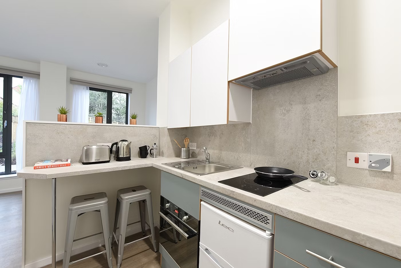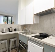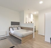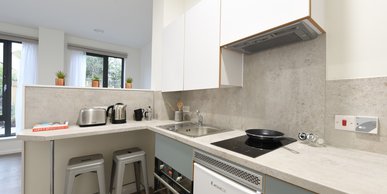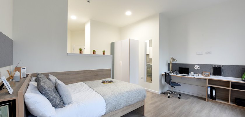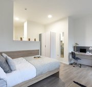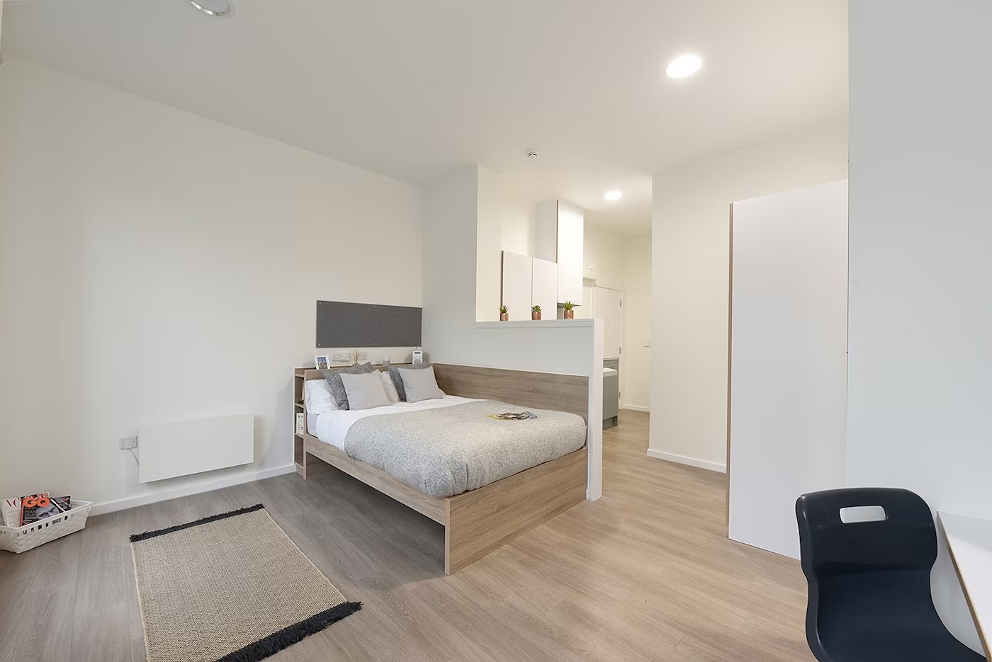 Self-contained studio with bedroom kitchen and bathroom Dual occupancy available Situated on the ground and 1st floors 17m² Double Bed Underbed storage, wardrobe, personal study space with desk and chair. Self-contained kitchen with fridge/freezer and microwave
