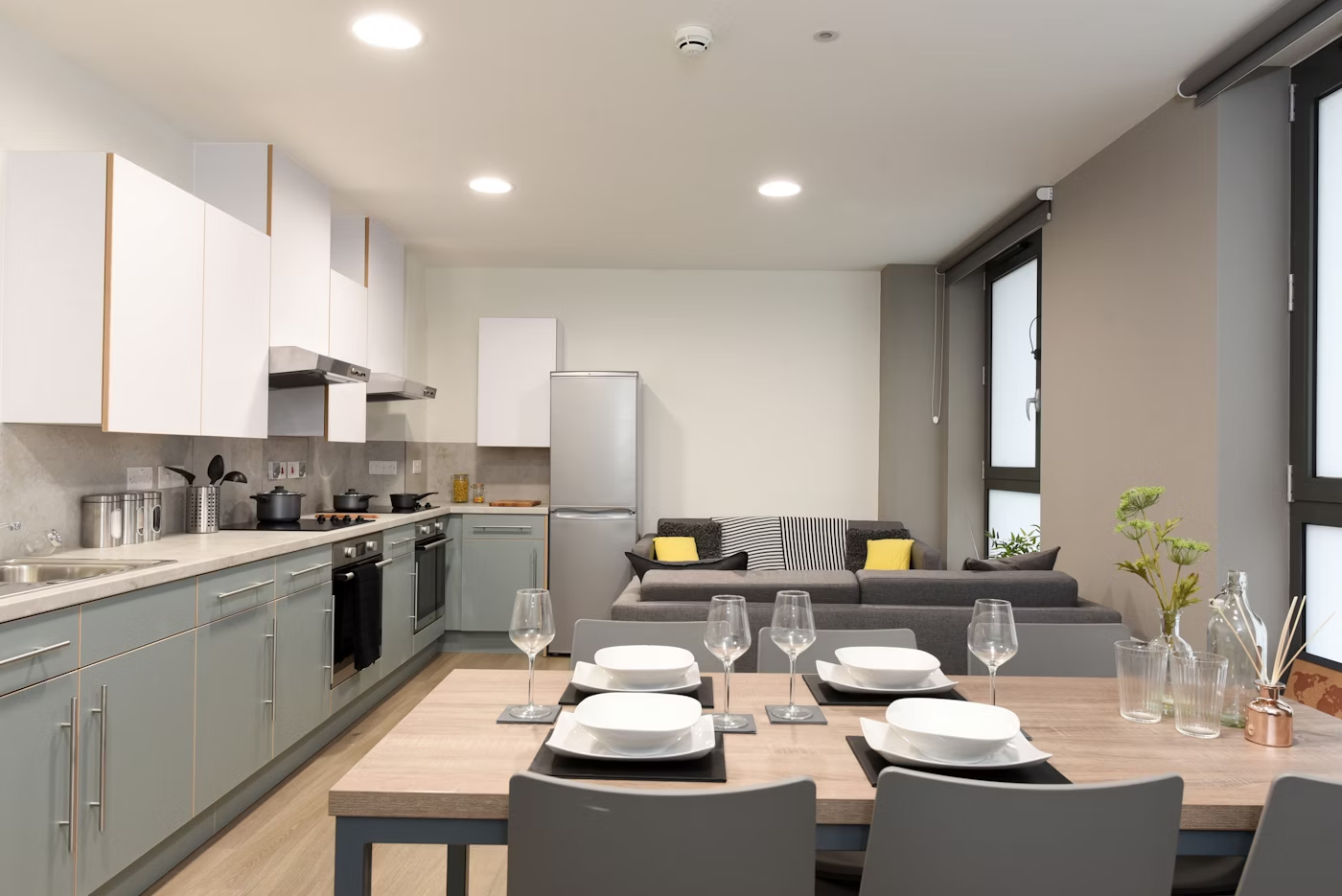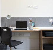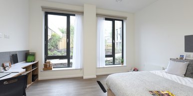 Communal kitchen and living space with up to 7 en-suite rooms per flat Situated on the ground and 1st floor Room Size: 13m² Small double bed Underbed storage, wardrobe, personal study space with desk and chair