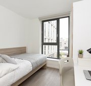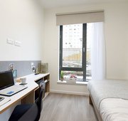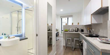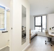 Communal kitchen and living space with up to 7 en-suite rooms per flat Situated on 6th & 7th floors Room Size: 17m² Small double bed Underbed storage, wardrobe, personal study space with desk and chair
