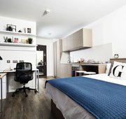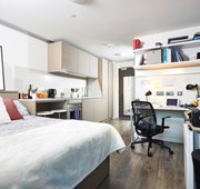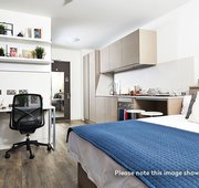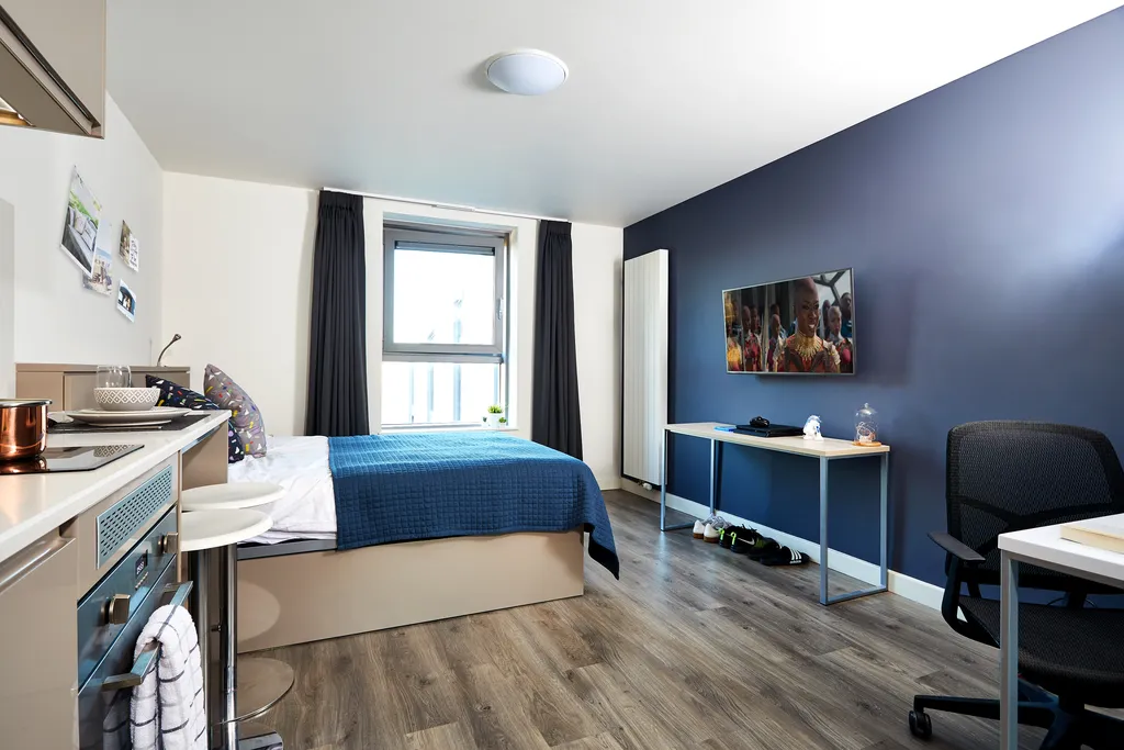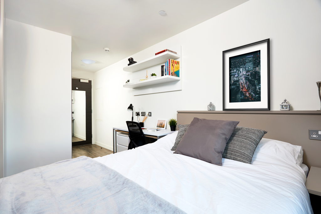The classic Vita Student studio with double bed, ensuite bathroom, desk area and kitchen. Prices may vary for floors.