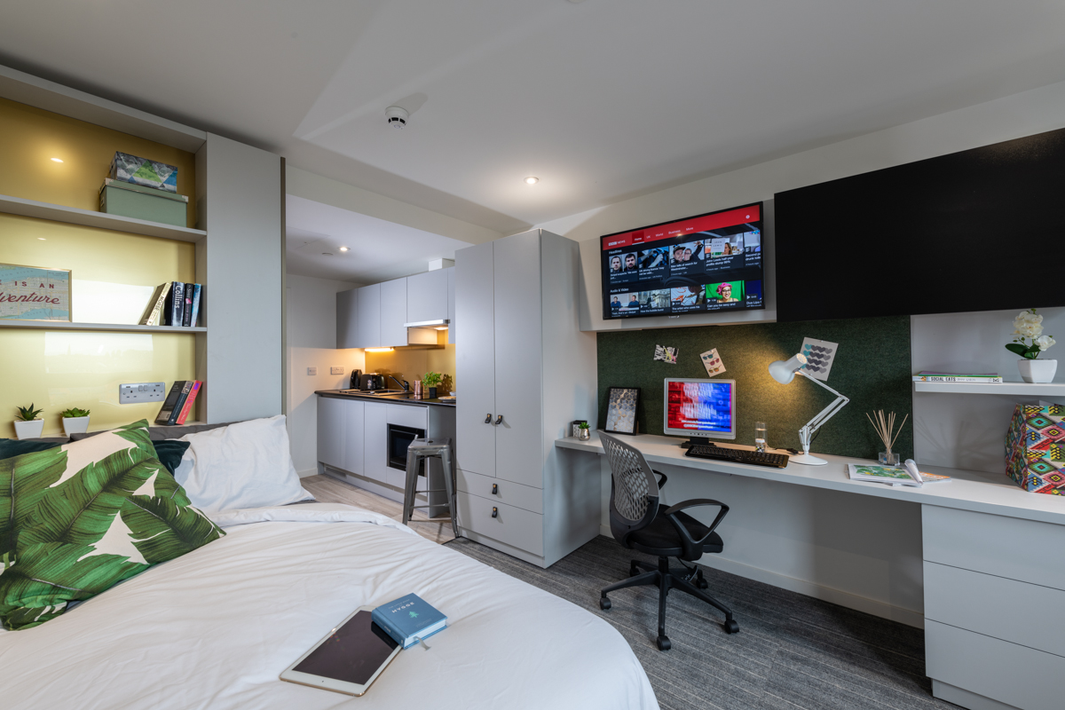 14.3 sq.m (approx), More then just a studio. Each room includes a small double bed, desk & chair, ample storage and en-suite shower in private options. Studios also come with a fully furnished kitchenette.