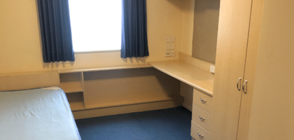 An en-suite room featuring a single bed, wardrobe, workspace, and a shared kitchen.