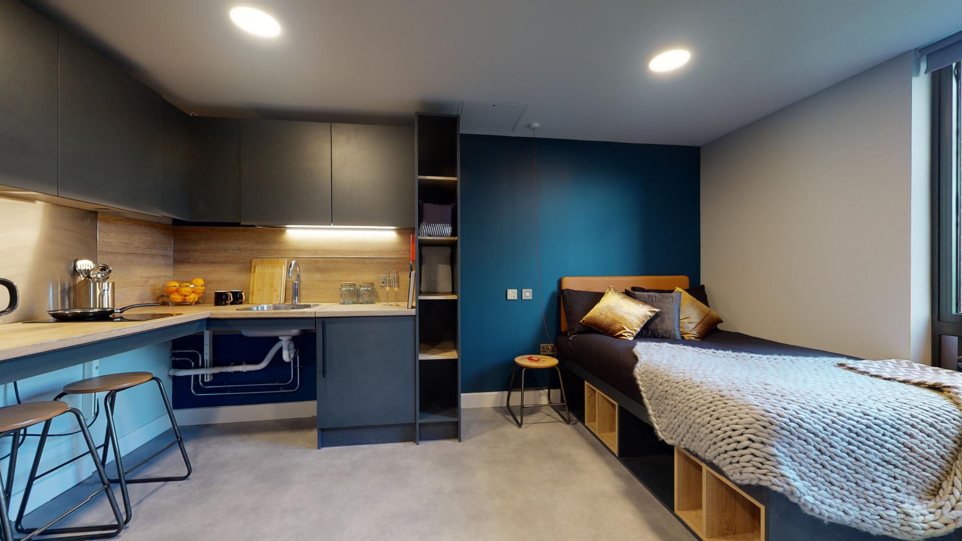 These Classic Ensuite rooms, which measure 12.4m² , are located on the property’s ground floor. If you’re looking for the perfect student room with all of the modern amenities you could want, we’re confident that this option will be the best fit. You’ll have a small double bed with underbed storage, an open clothes rail, a USB plug next to the bed to stream your favourite films and TV shows on your Samsung 43-inch TV, a private ensuite bathroom and a shared kitchen area. You’ll also have plenty of room with a breakfast bar and comfortable seating, as well as first-class social spaces like our buzzing common room, a central landscaped garden, as well as the sky lounge.