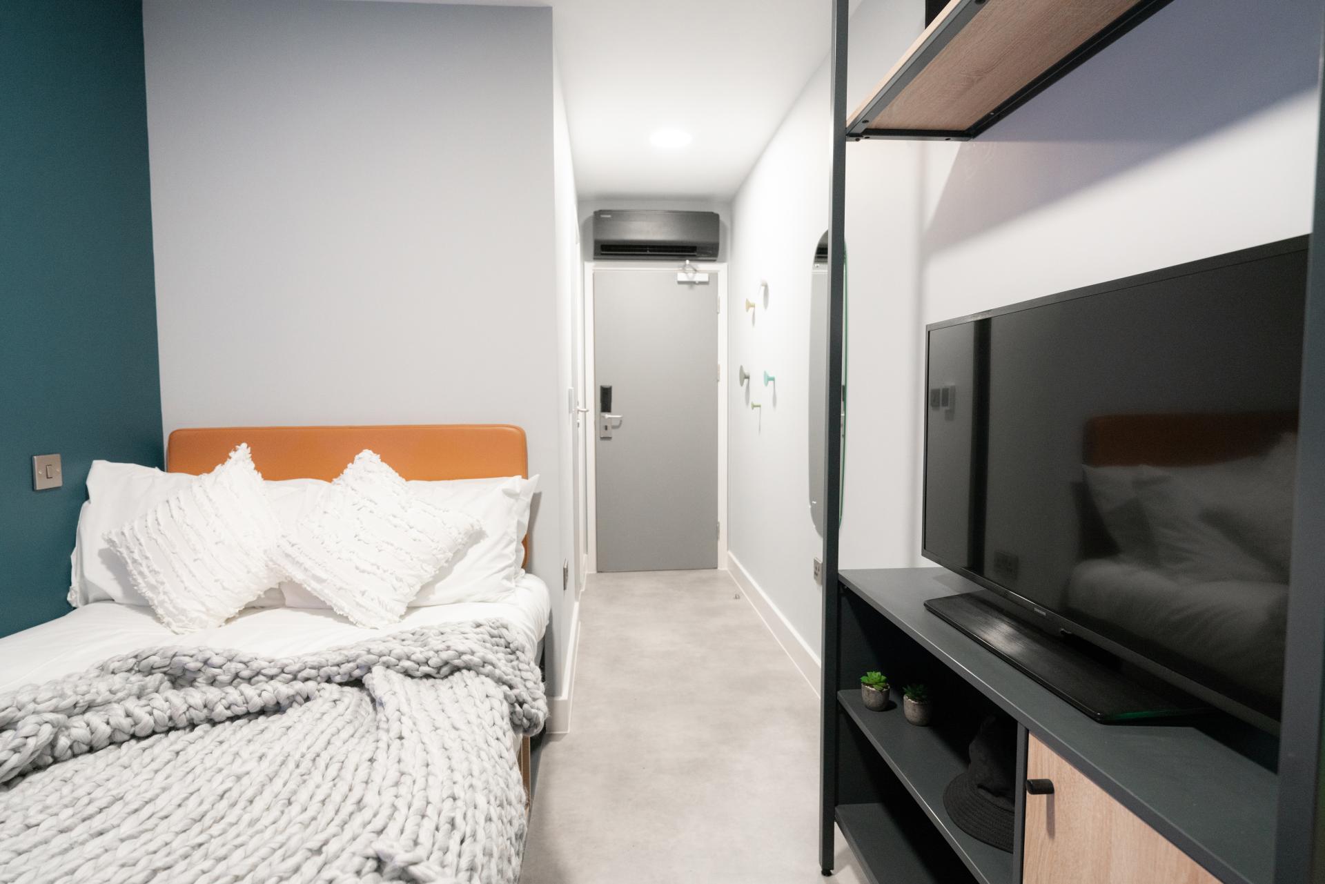 Our 19M² Classic Studios include a comfortable bed, an open and closed wardrobe, a private kitchen, a dining area, a lounge space, and a study desk for all of your academic needs. The en-suite bathroom provides privacy, and the Samsung TV and air conditioning keep you comfortable all year. There is plenty of storage space for your belongings, and you can take advantage of Guilden Village’s on-site amenities, which include a games room, a cinema room, and more!