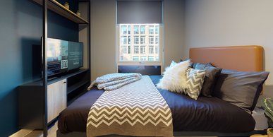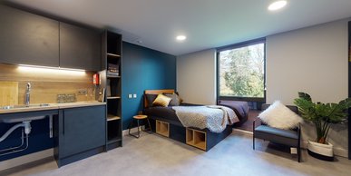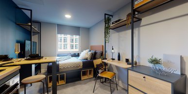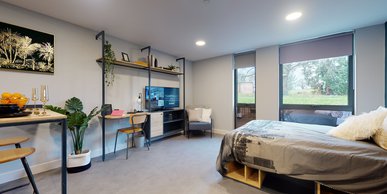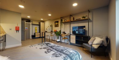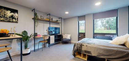 This 27.8m² Accessible Studio offers plenty of space, including a large bed, study area, private kitchen, and lounge area. The accessible wet room with shower provides extra convenience and complete privacy. Large windows provide excellent views of Stoke Park to the south-east, and air conditioning keeps you comfortable all year. You can also watch a Samsung TV for entertainment. Beyond your room, Guilden Village provides a variety of amazing amenities such as a cinema room, games room, rooftop terrace, and more to keep you active and entertained.