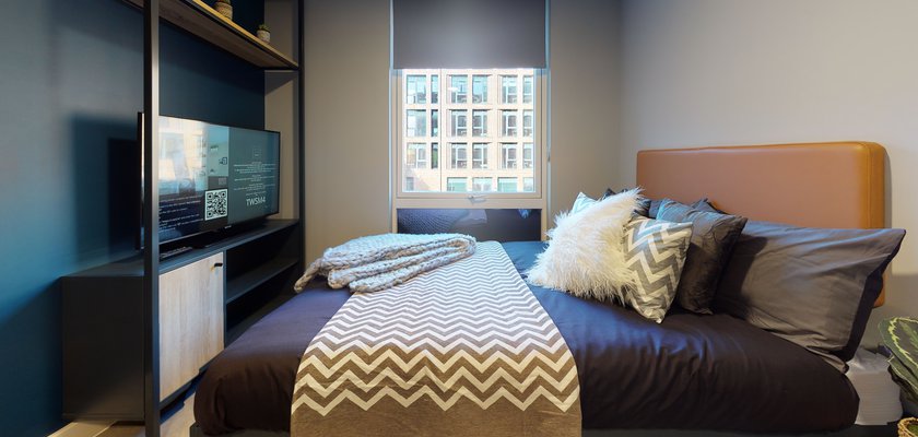 Our 19M² Classic Studios include a comfortable bed, an open and closed wardrobe, a private kitchen, a dining area, a lounge space, and a study desk for all of your academic needs. The en-suite bathroom provides privacy, and the Samsung TV and air conditioning keep you comfortable all year. There is plenty of storage space for your belongings, and you can take advantage of Guilden Village’s on-site amenities, which include a games room, a cinema room, and more!