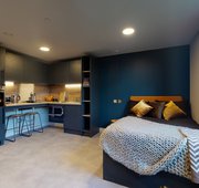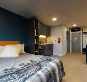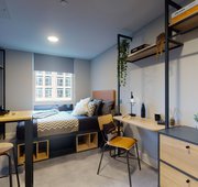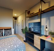 These Classic Ensuite rooms, which measure 12.4m² , are located on the property’s ground floor. If you’re looking for the perfect student room with all of the modern amenities you could want, we’re confident that this option will be the best fit. You’ll have a small double bed with underbed storage, an open clothes rail, a USB plug next to the bed to stream your favourite films and TV shows on your Samsung 43-inch TV, a private ensuite bathroom and a shared kitchen area. You’ll also have plenty of room with a breakfast bar and comfortable seating, as well as first-class social spaces like our buzzing common room, a central landscaped garden, as well as the sky lounge.