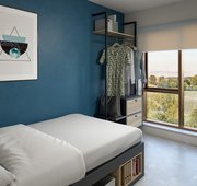 Our 29.1m² Premium Studio provides ample space with a comfortable double bed, modern furnishings, a study area, and plenty of storage, including an open and closed wardrobe. The en-suite bathroom ensures privacy, and the private kitchen, lounge and dining area are ideal for relaxing and entertaining. Enjoy your Samsung TV while staying comfortable with air conditioning. Furthermore, the premium studio offers stunning views of Stoke Park to the south-east. Beyond your room, Guilden Village has incredible amenities like a rooftop terrace with incredible views, a cinema room, and a gym.