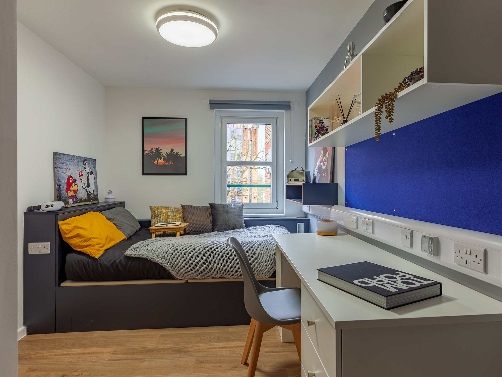 Our Deluxe En-Suite measuring 16sqm is the perfect choice. As the largest of our en-suite rooms, you’ll have a much larger bathroom, as well as a comfortable small double bed and a desk area for those all-important study sessions. When it’s time to socialise, there are plenty of fantastic communal spaces to head to including our fully soundproof music room, a cinema room, communal lounge and gaming room. Book now for the next academic year!