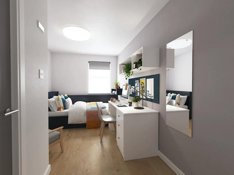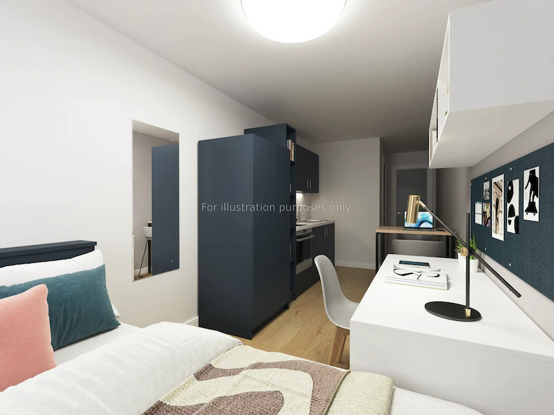 A new refurbishment for the 23/24 academic year, our Premium Studio measuring 17-20 sq m is the perfect choice for students wanting to live independently. Your self-contained student apartment features a small double bed with under-bed storage space, a fully fitted kitchen with a breakfast bar, as well as a private ensuite bathroom. You can still make new friends thanks to our amazing social spaces including a fully soundproof music room, lavish cinema room, a buzzing communal lounge and gaming room. Book your room now before they all get booked up!