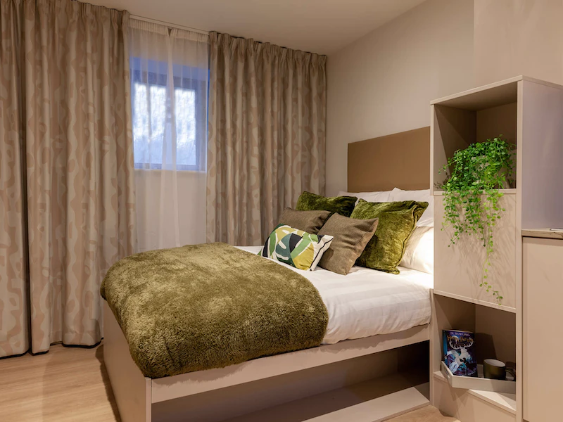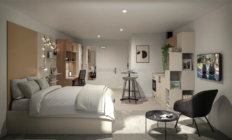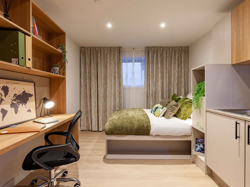 Our Bronze Studio option at HD1 has been designed to enhance your student experience and comes fully furnished with all the amenities you could need including a comfy bed, a private en-suite bathroom, a large study space, ample storage space, along with a modern kitchenette. You get the best of both worlds when living within our luxury property, as you can love life in your self-contained flat whilst also having the opportunity to meet new people and socialize. Head downstairs to our boujee cinema room to watch a film on the big screen, or hang out in the communal lounge and get to know your neighbors.