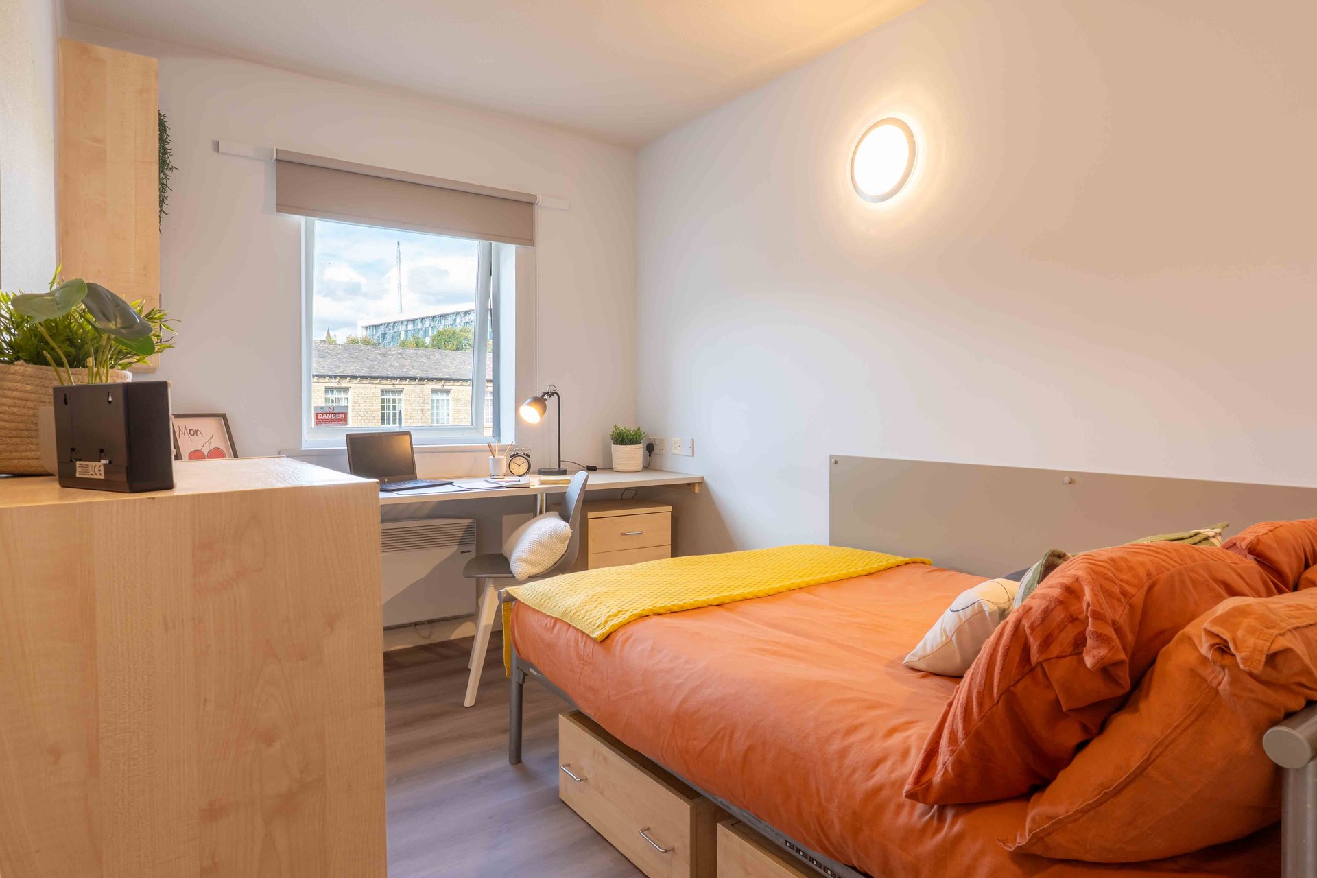Located close to the River Colne and within walking distance of Huddersfield town centre, Aspley House has a variety of en suite rooms and studios, all equipped with a bed, study area, storage and shower room. The site also offers various services to residents, including free WiFi and an onsite laundry.