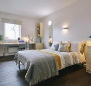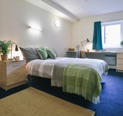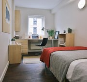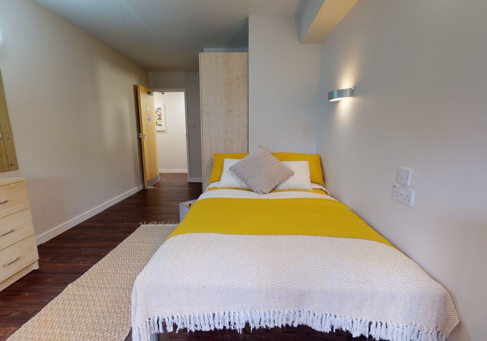 ASPL400-120625Renovated to a high standard, this is the biggest and best en suite on offer in Aspley House. With wooden floors, double bed, private shower and toilet, study area with desk and chair and lots of storage space, it’s well kitted out. Your room comes with a spacious shared kitchen and living room that comes with comfy sofas, dining table and chairs. You’ll also benefit from multiple social and outdoor spaces, a laundry and a gym also on hand in the building.