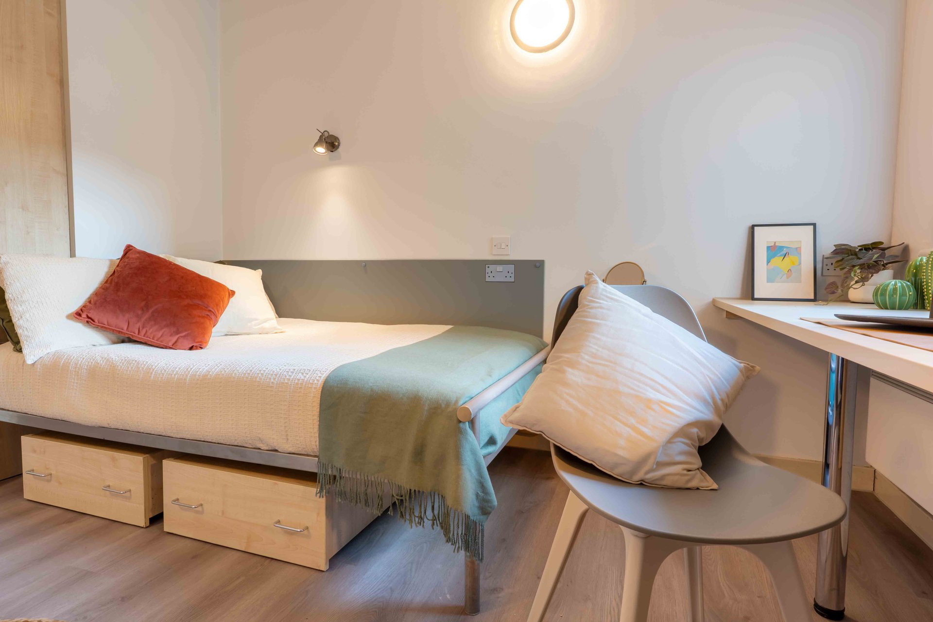 ASPL300-031125For those wanting a little extra space and storage, the well-sized Gold En Suite rooms come with a private bathroom, study area and small double bed with underbed storage. You’ll also have access to a spacious shared kitchen and living room that comes with comfy sofas, dining table and chairs. You’ll also benefit from multiple social and outdoor spaces, a laundry and a gym also on hand in the building.