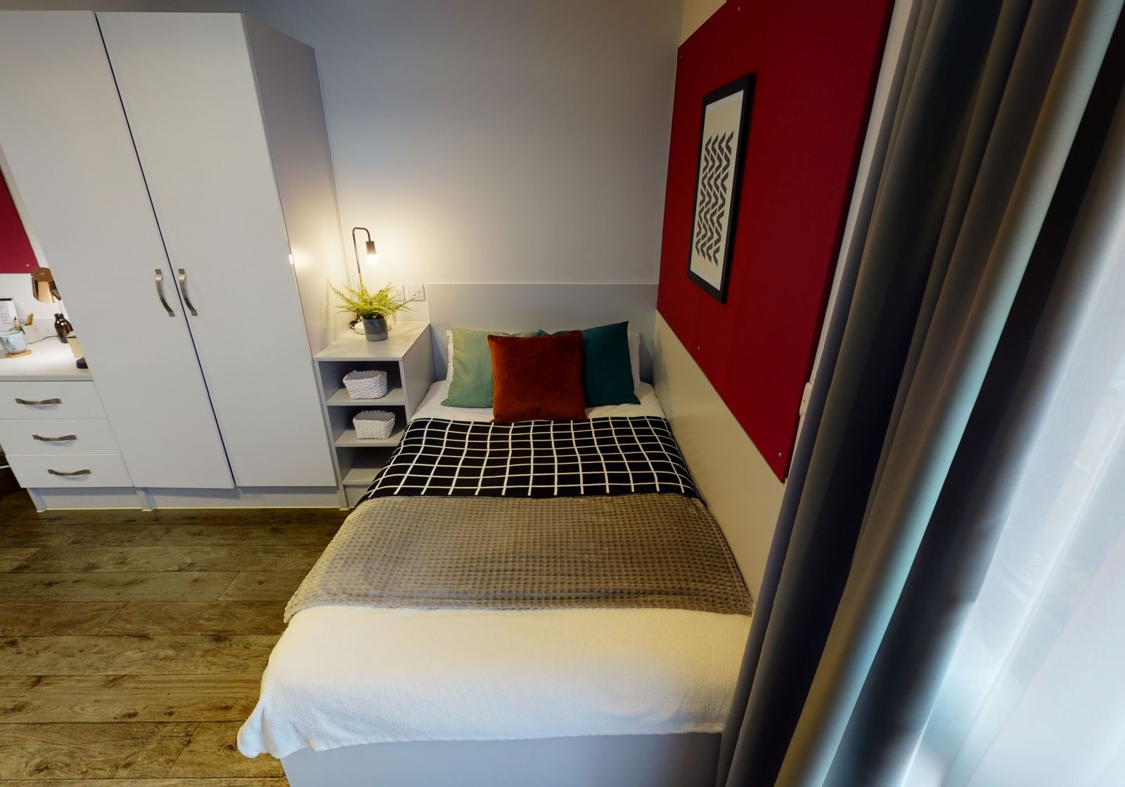 CAST200-031125These rooms may be compact, but they still give you a small double bed, study desk and chair, private bathroom and plenty of storage space. Finished to a high standard, Copper en suites are located on the ground floor. Castings is brilliantly equipped with beautifully designed social spaces, a games room with PlayStation 4 and large flat-screen TVs, a laundry and a 24-hour gym. Your spacious shared kitchen and living area means you get the best of privacy and a social living experience.