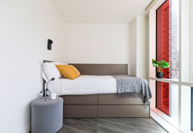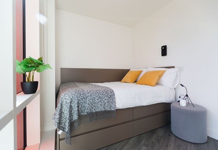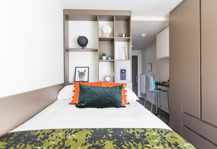 Our Bronze Studios are our standard size and feature a private ensuite shower room, a 4ft double bed with storage, plenty of additional storage and study space, as well as your own complete kitchenette.