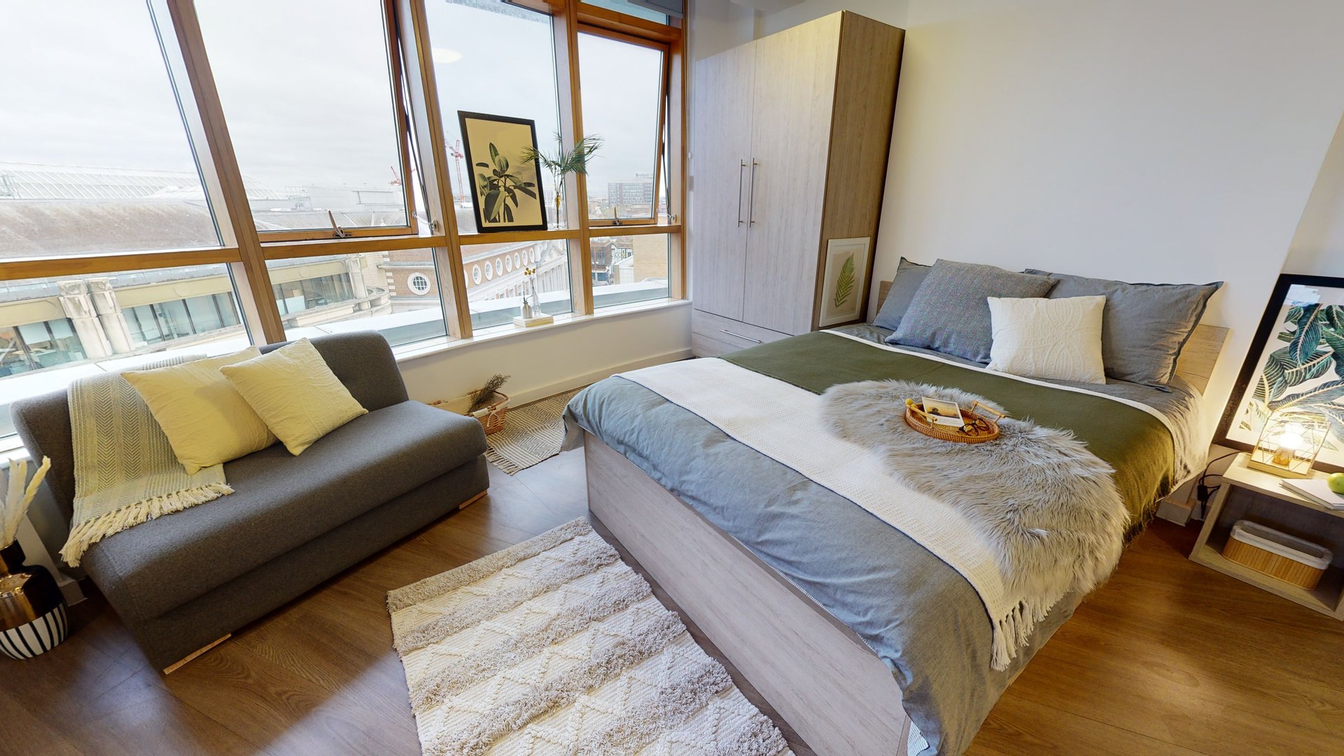 KING350-031125These top-end rooms range from 24-28 sq m, and situated on the top floor of the building they give fantastic views over the city from their expansive windows. They’re perfect for a couple sharing or someone wanting more room for themselves, with private bathroom, larger wardrobes, fully fitted kitchen, double bed and separate living space. With a huge amount of space, lots of natural light and modern, smart fittings and furnishings, these great rooms give a luxurious living experience. Offering lots of storage space and all the facilities you’ll need plus an onsite gym, it’s the ultimate student residence.