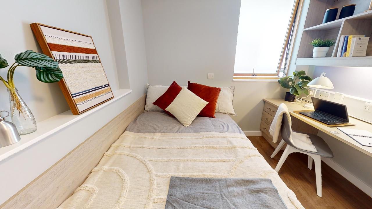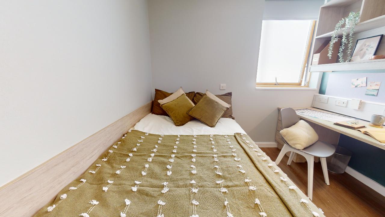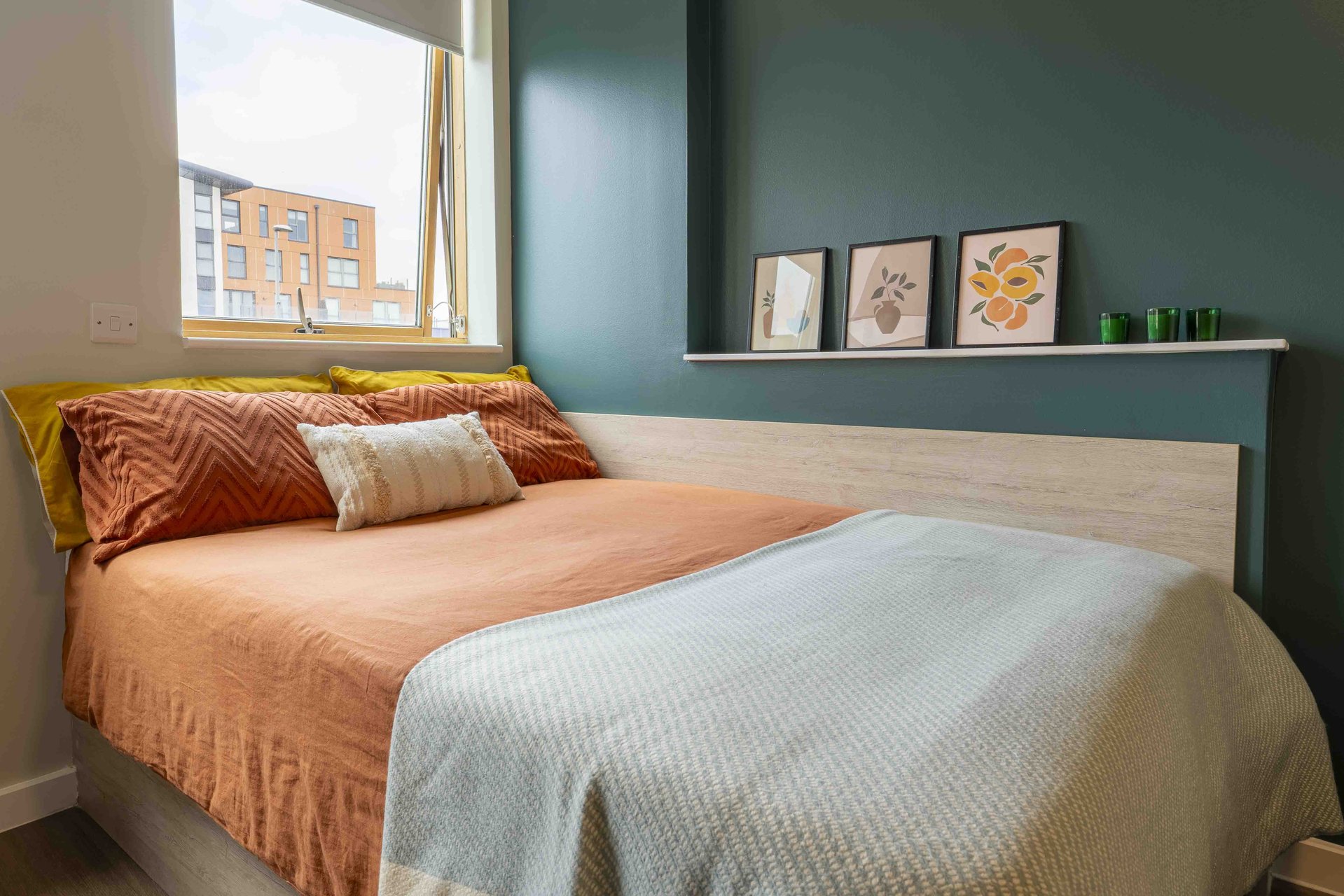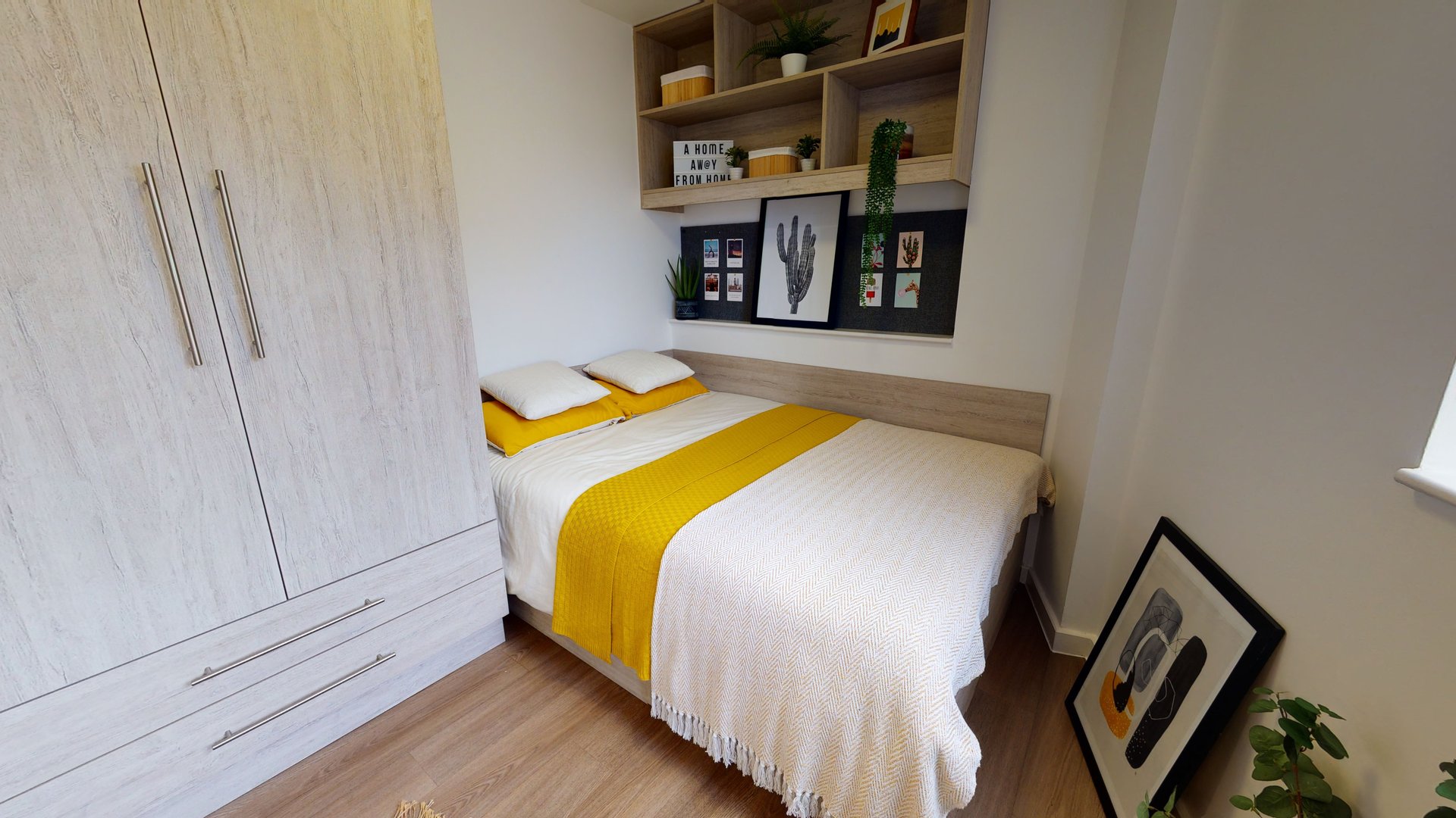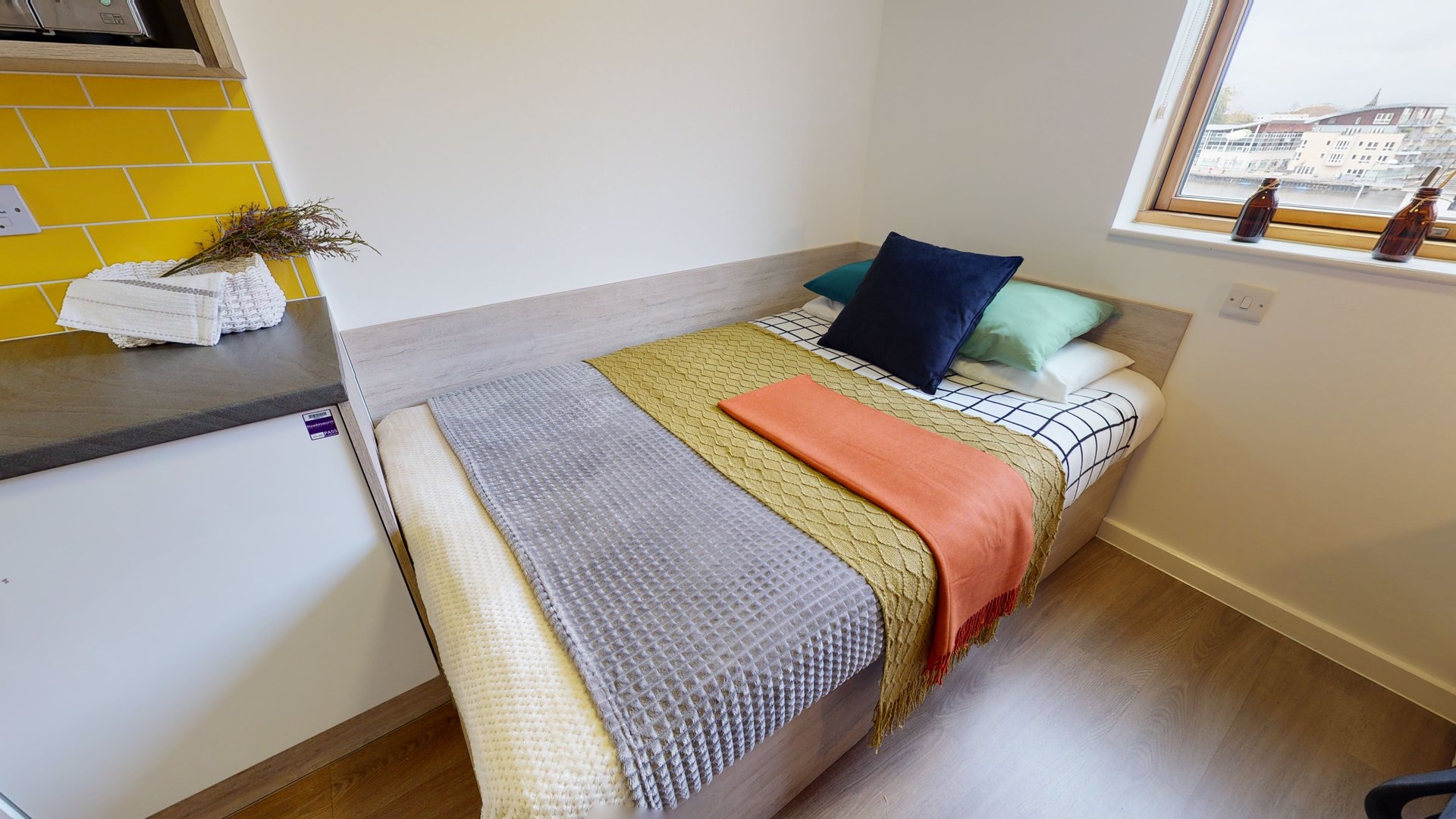 KING350-031125Offering a little extra space of 14-16 sq m and located on the lower two floors, these rooms have everything you need and are finished to a high standard with modern, stylish design. With a small double bed, plenty of storage, private bathroom and fully fitted kitchenette, you’ve got all the essentials right in your room. With a gym on site too, you’ll have everything you need for a great lifestyle at uni.