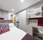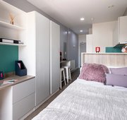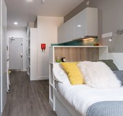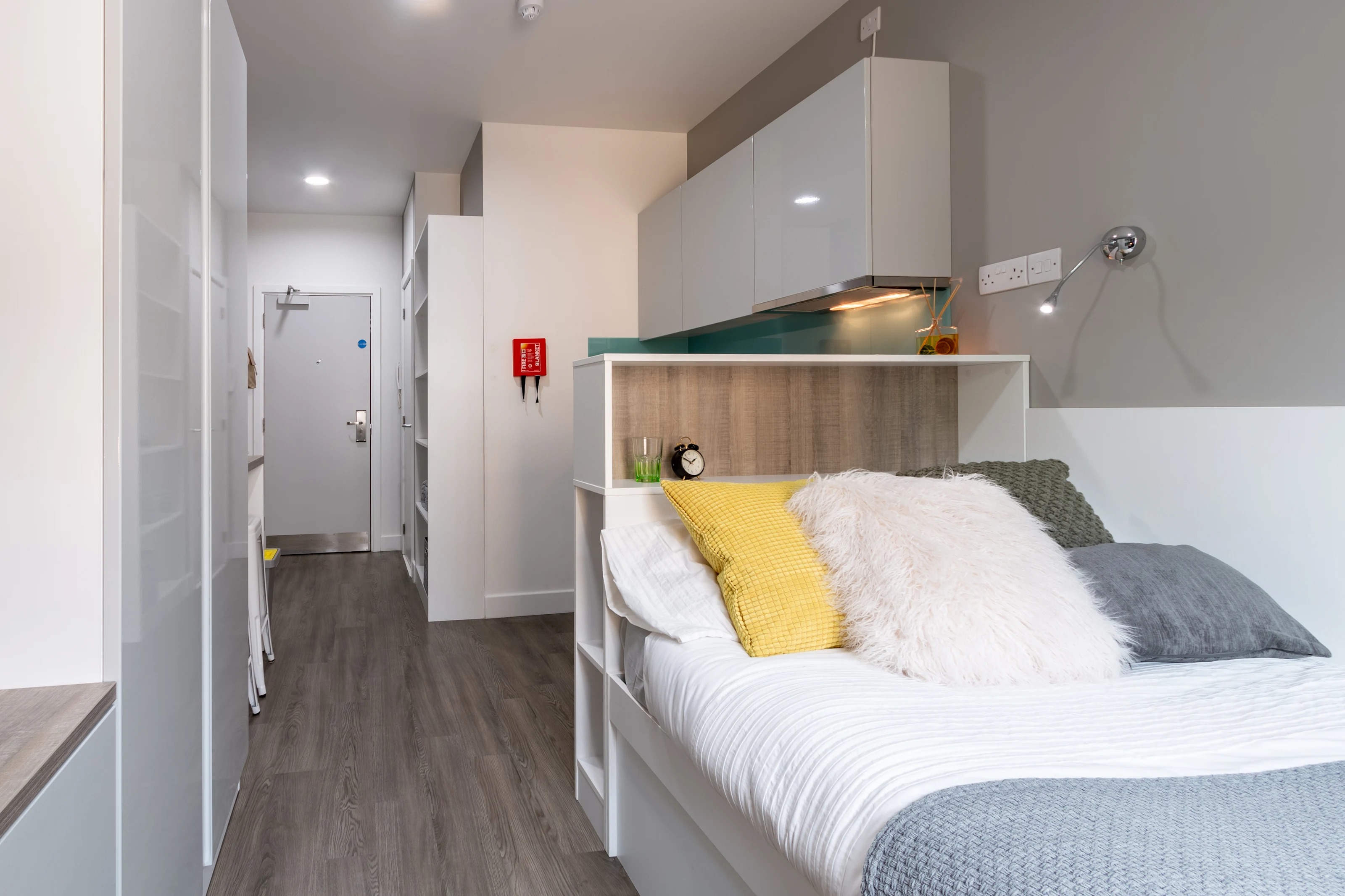 Room sizes can vary from 15.8m2 to 17.7m2. DDA rooms available on request. Double bed with under bed storage En-suite shower room Kitchenette with electric hobs, combi microwave oven and fridge/freezer Breakfast bar Study space with desk and desk chair Double wardrobe, book shelves and secure under-desk storage