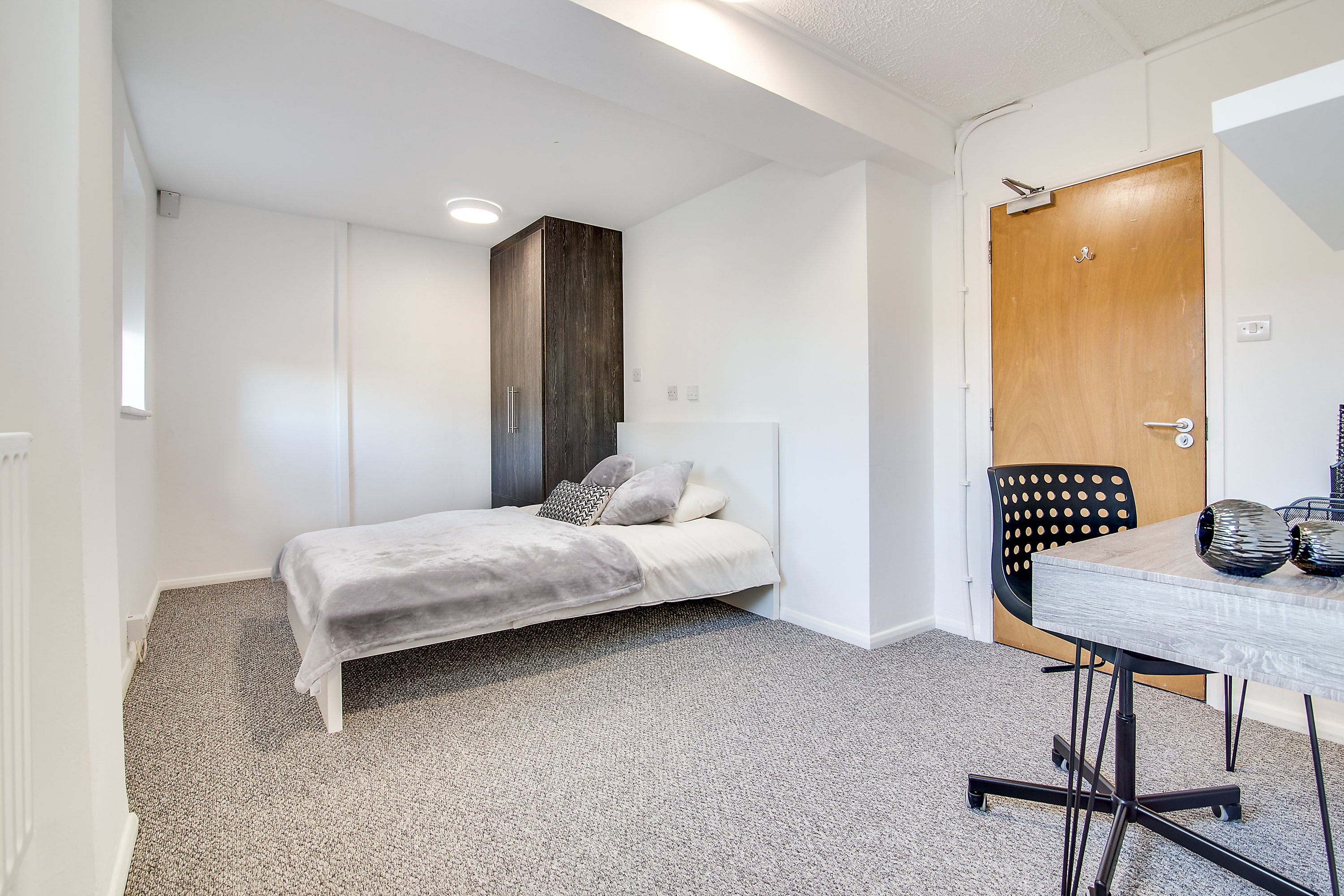 The spacious deluxe double en-suite room is the very best of contemporary and comfortable student living. The stylish room includes a double bed, study area with desk and chair, lounge area, ample storage space and an en-suite shower room. Relax in your room and socialise in the shared kitchen/diner; with the deluxe en-suite room you can have the best of both worlds. Shared space includes: oven, hob, fridge freezer, microwave, and a breakfast bar with stools for relaxing.