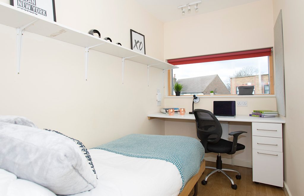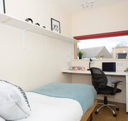 Your cluster single ensuite room gives you space to study and sleep, but also be sociable in the shared kitchen/diner. Each room includes a study area with desk and chair, single bed, storage space and your own private ensuite bathroom. Shared kitchens include an oven, hob, fridge freezer, microwave, and a breakfast bar with stools for relaxing.