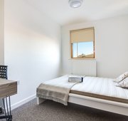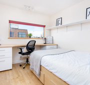 The spacious deluxe en-suite room is the very best of contemporary and comfortable student living. The stylish room includes a double bed, study area with desk and chair, lounge area, ample storage space and an en-suite shower room. Relax in your room and socialise in the shared kitchen/diner; with the deluxe en-suite room you can have the best of both worlds. Shared space includes: oven, hob, fridge freezer, microwave, and a breakfast bar with stools for relaxing.