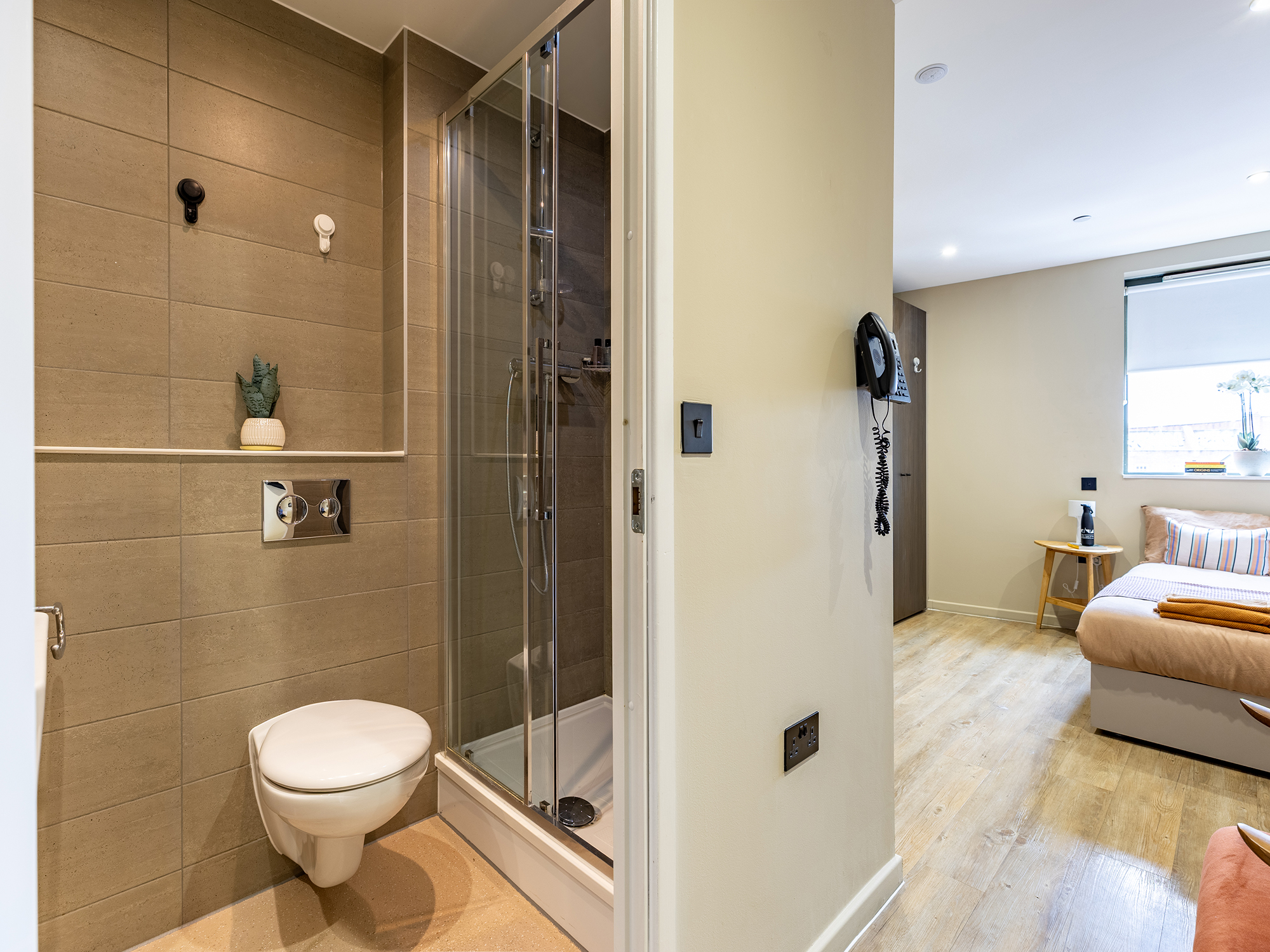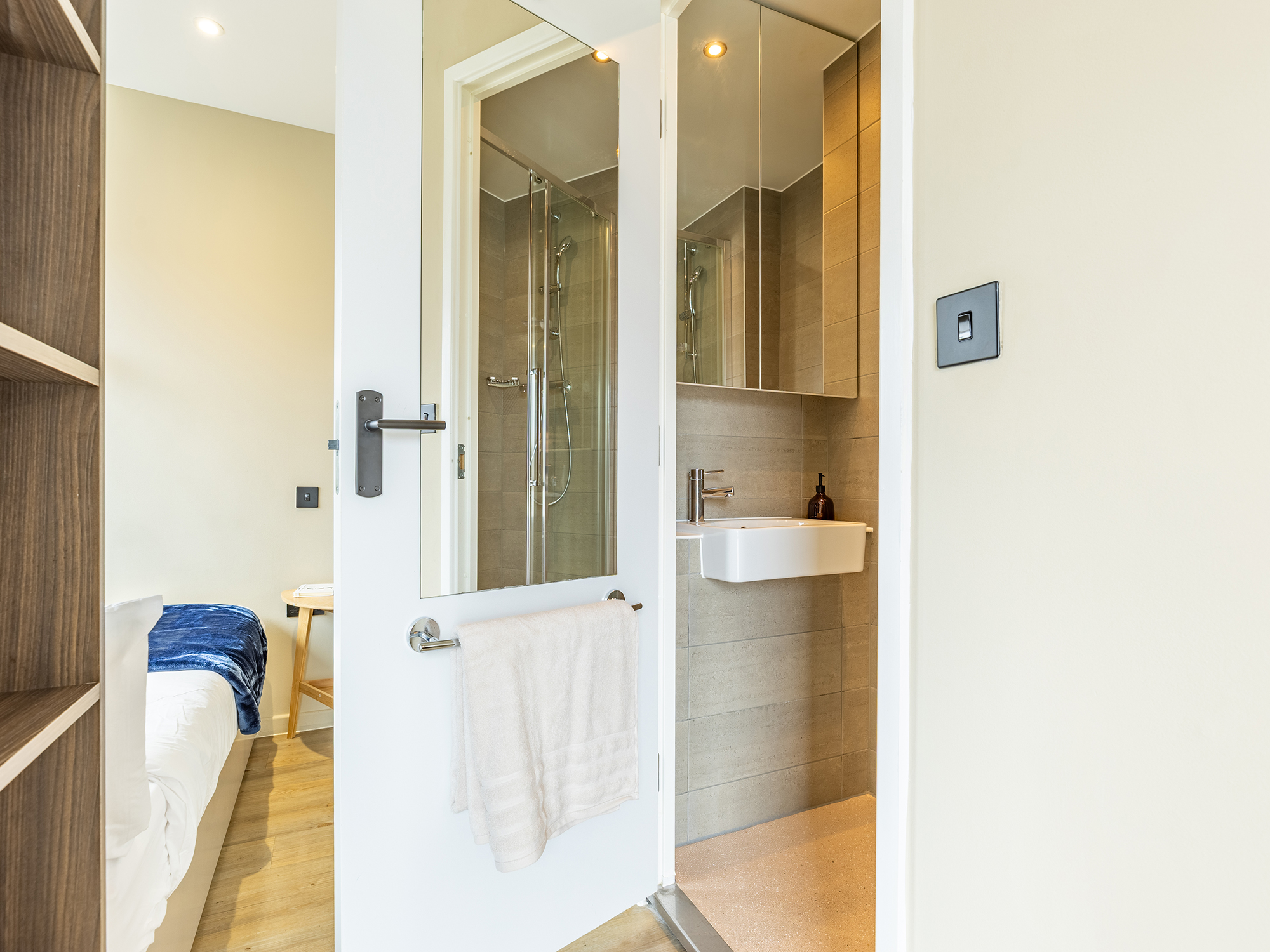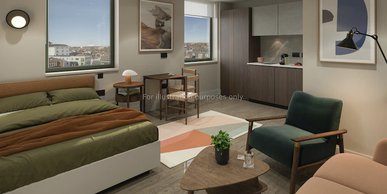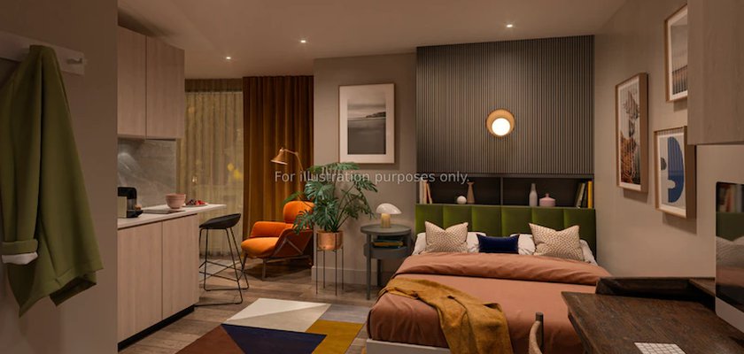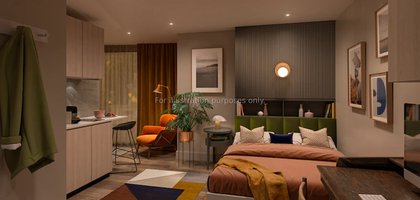 This studio comes with a double bed with under bed storage, ensuite room, fully fitted kitchenette and ample storage. You will also have access to the common room, rooftop terrace and onsite laundry facilities.
