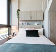 These rooms are located in the Tower block and provide more floor space than the Bronze ensuites. Bathroom Private Kitchen Shared Utility bills All included Room size 14.1m² 3/4 double bed, study area and plenty of storage Private bathroom with large mirror Kitchen and living room with TV and sofas shared by 6 bedrooms