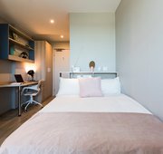 These private studio rooms will feature a kitchenette, dining area, ensuite bathroom and all you need from your student room, with a comfy double bed, desk and ample storage. Bathroom Private Kitchen Private Utility bills All included Room size 17.5m² 3/4 double bed, wardrobe and study area complete with a desk and chair Private bathroom with large mirror Fully equipped private kitchen with a table and chairs Private bathroom with large mirror Fully equipped private kitchen with a table and chairs.