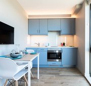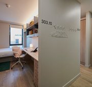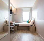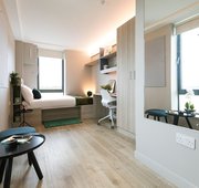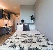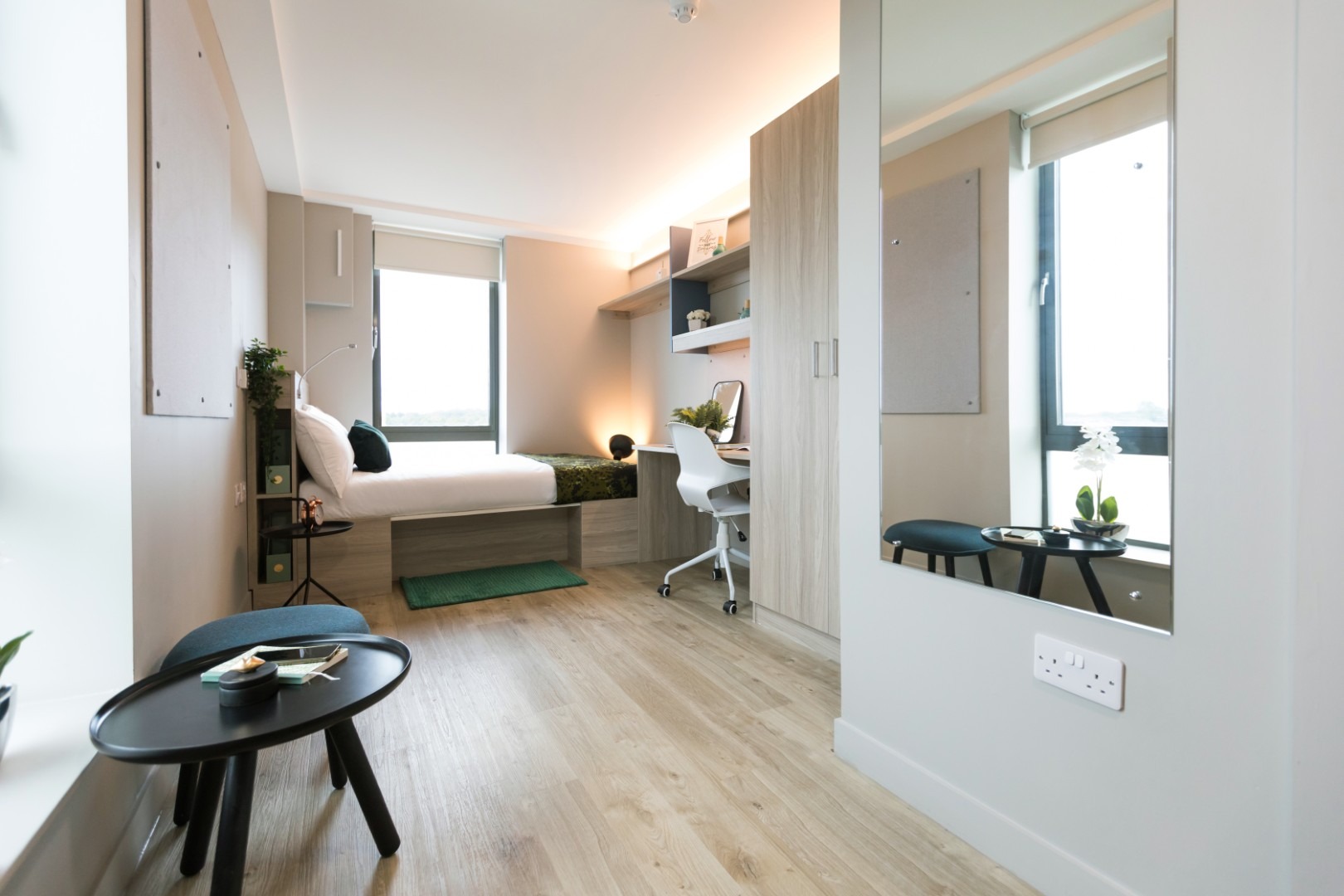 These private studio rooms will feature a kitchenette, dining area, ensuite bathroom and all you need from your student room, with a comfy double bed, desk and ample storage. Bathroom Private Kitchen Private Utility bills All included Room size 17.5m² 3/4 double bed, wardrobe and study area complete with a desk and chair Private bathroom with large mirror Fully equipped private kitchen with a table and chairs Private bathroom with large mirror Fully equipped private kitchen with a table and chairs.